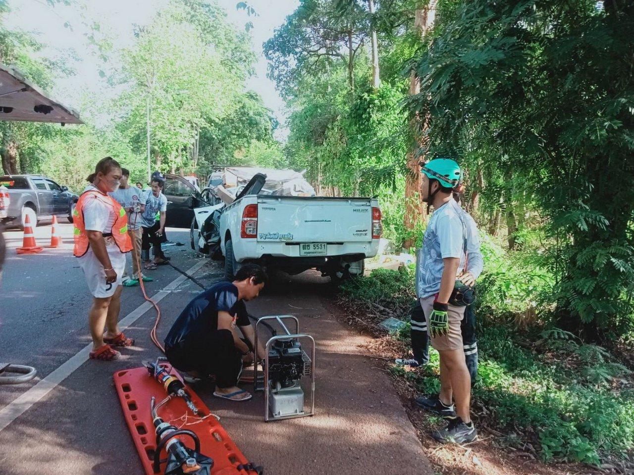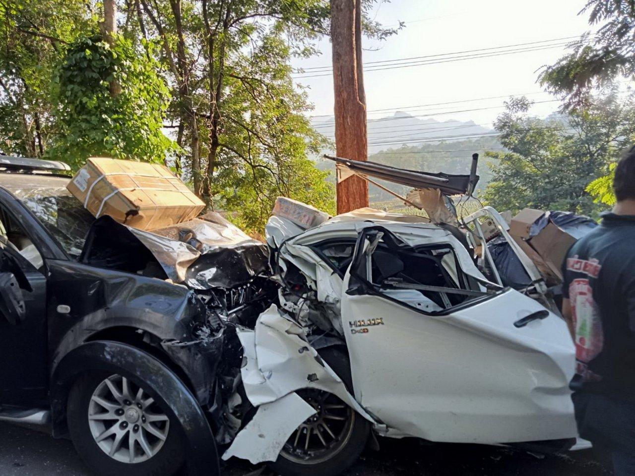 วันพระใหญ่เมืองกาญจน์ตายดุ หลังกระบะส่งพัสดุของเอกชนคนขับเกิดหลับใน เสียหลักข้ามเลนประสานงากับรถปาเจโร่ของผัวเมียชาวนครปฐมที่วิ่งสวนมา บนถนนสาย 323 พื้นที่ อ.ไทรโยค จนพังยับตายคาที่ทั้งหมดรวม 3 ศพ