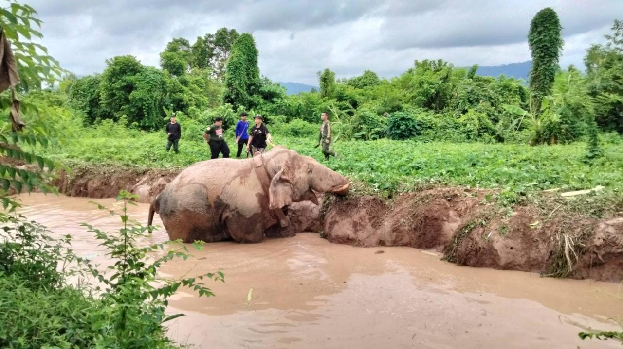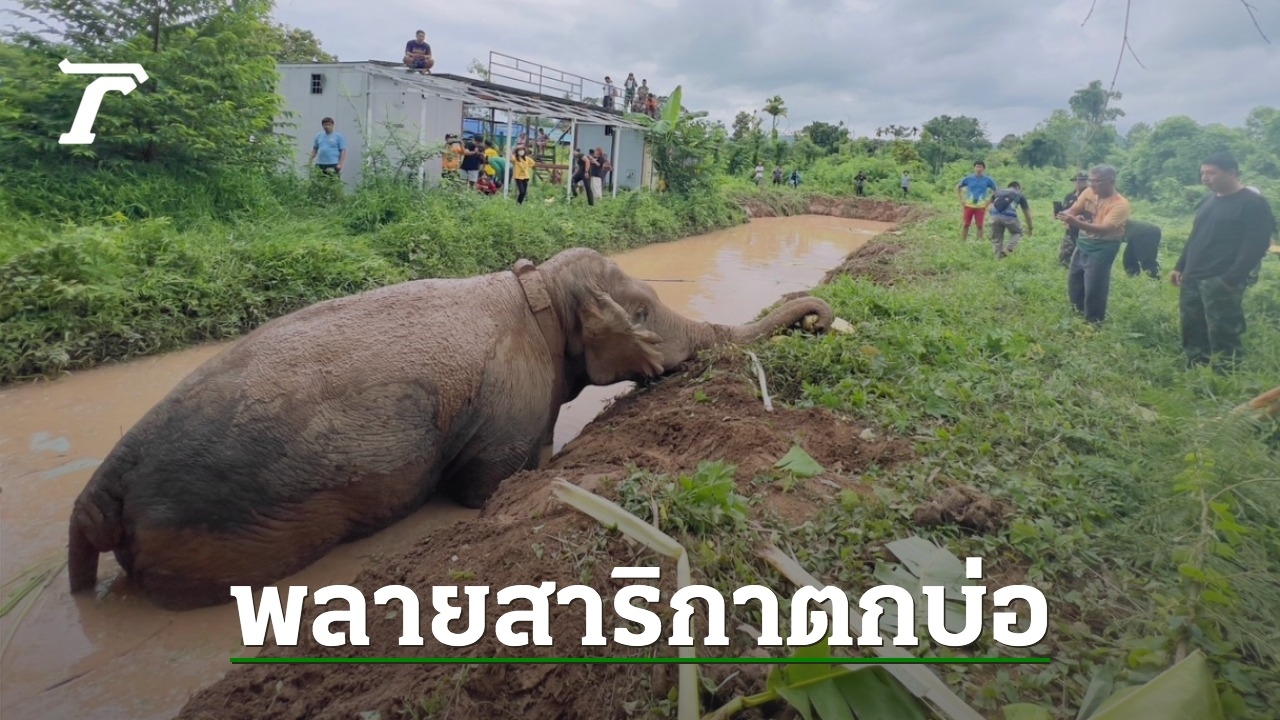พลายสาริกา ช้างเซเลบ ประจำตำบลสาริกา อ.เมืองนครนายก พลาดท่าพลัดตกบ่อน้ำลึก 2 เมตร ชาวบ้านหาอาหารเสริมพลังมาให้กิน ก่อนนำรถแบ็กโฮมาขุดทำทางลาดริมบ่อ ให้พ่อพลายขึ้นมาได้อย่างปลอดภัย