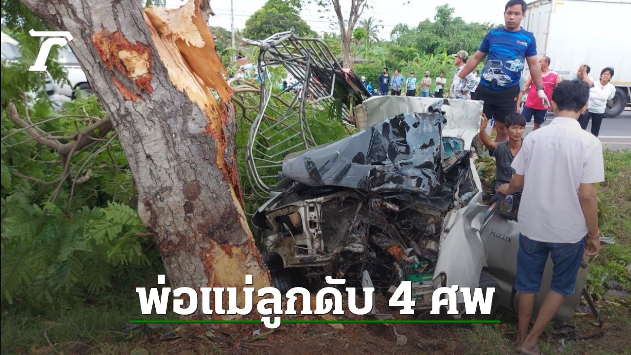 รถกระบะพ่อ แม่ ลูกชาย ลูกสาวพากันไปซื้อต้นพันธุ์ทุเรียนหมอนทองที่ชุมพร ขับกลับบ้านจ.กาญจนบุรี เสียหลักตกร่องกลางถนนเพชรเกษม ช่วงอ.สามร้อยยอด ประจวบฯ ชนต้นไม้เสียชีวิตยกครัว 4 ศพ