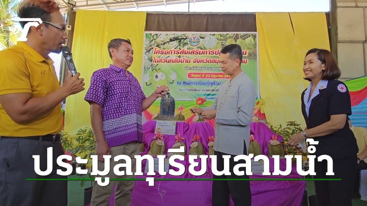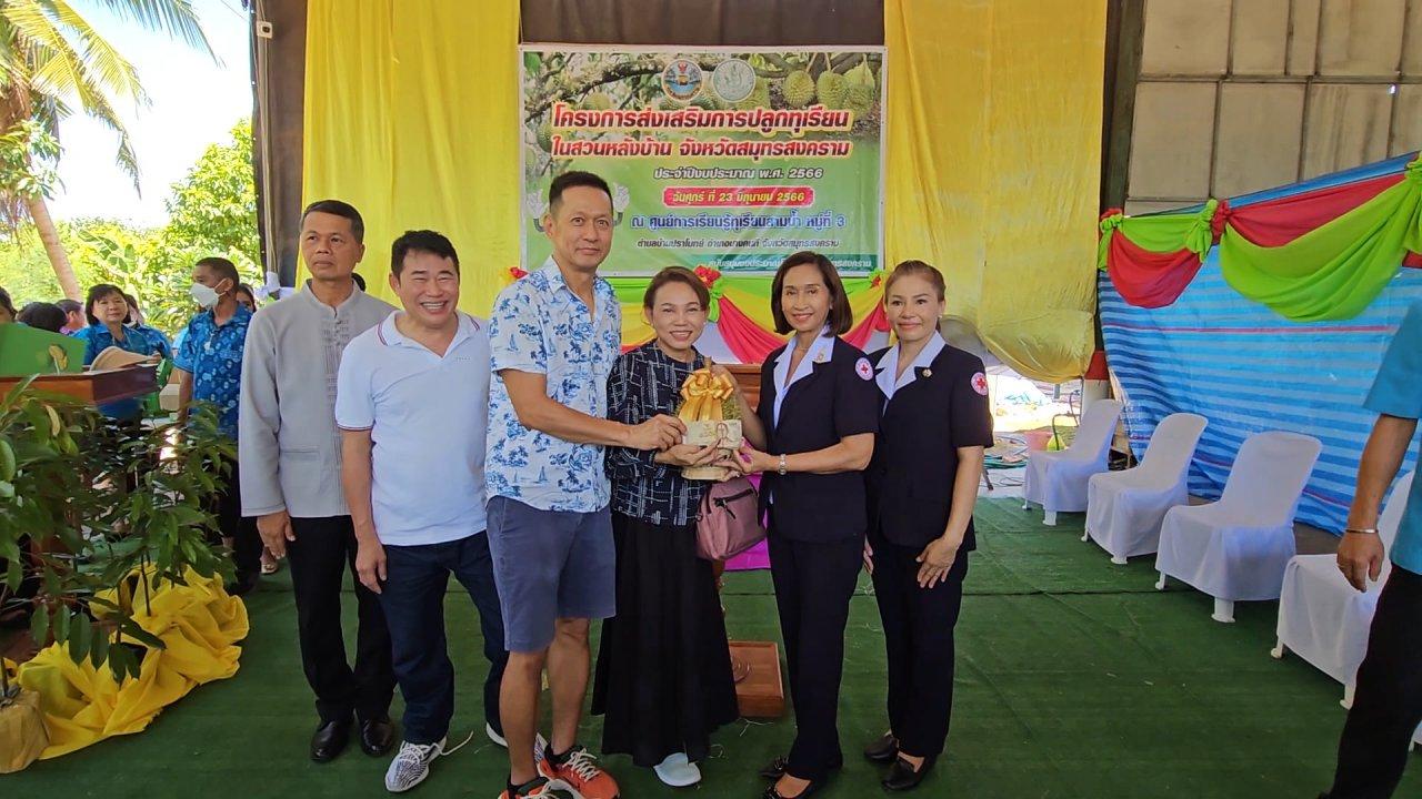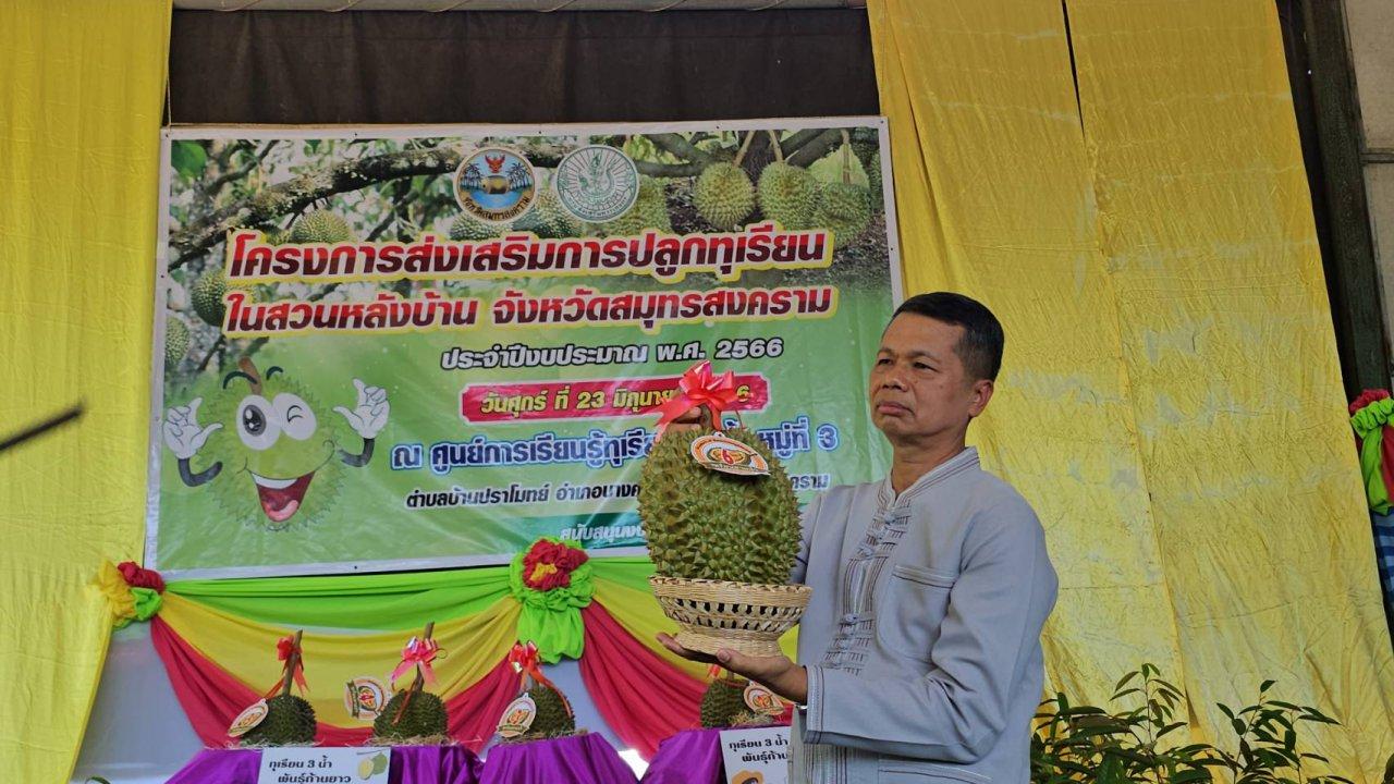 ผู้สื่อข่าวรายงานว่า ที่ศูนย์การเรียนรู้ทุเรียน 3 น้ำ ตำบลบ้านปราโมทย์ อำเภอบางคนที จังหวัดสมุทรสงคราม นายสมนึก พรหมเขียว ผู้ว่าราชการจังหวัดสมุทรสงคราม พร้อมนายบรรจงศิลป์ วุฒิอุทัย เกษตรจังหวัดสมุทรสงคราม และหน่วยงานที่เกี่ยวข้อง ได้จัดโครงการส่งเสริมการปลูกทุเรียนในสวนหลังบ้าน เพื่อส่งเสริมให้เกษตรกรใช้พื้นที่สวนหลังบ้านให้เป็นประโยชน์สูงสุด โดยปลูกทุเรียนแซมในสวนหลังบ้าน อีกทั้งเพื่อเพิ่มโอกาสในการสร้างรายได้ และลดรายจ่ายในครัวเรือน สอดคล้องกับสถานการณ์ โดยสนับสนุนต้นพันธุ์ทุเรียนพันธุ์ดี ให้กับเกษตรกรที่เข้าร่วมโครงการ จำนวน 145 ราย / รายละ 2 - 5 ต้น รวมทั้งสิ้น 500 ต้น แยกเป็น อำเภออัมพวาจำนวน 200 ต้น และอำเภอบางคนที จำนวน 300 ต้น