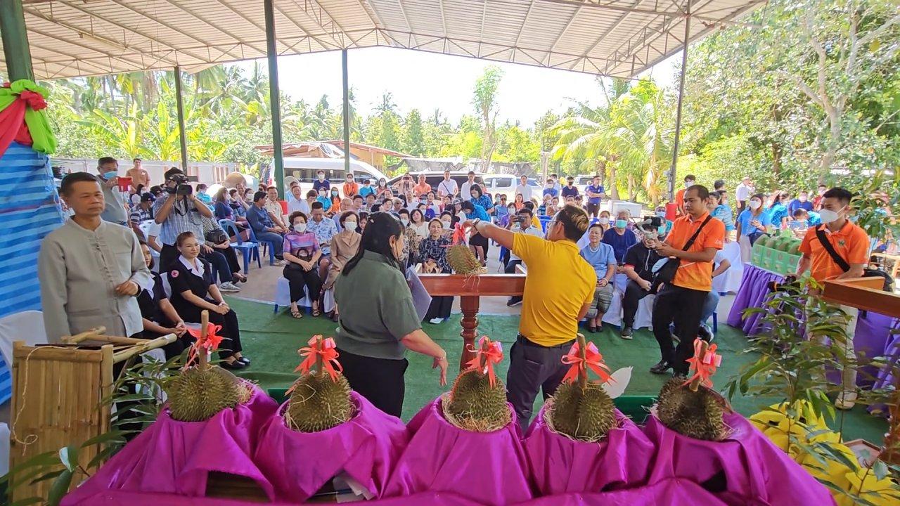 จากนั้นได้มีการประมูลทุเรียน 3 น้ำ กรอบมัน ตามหากันข้ามปี พันธุ์ก้านยาว จำนวน 5 ลูก ราคาประมูลเริ่มต้นที่ลูกละ 10,000 บาท ส่วนพันธุ์หมอนทอง จำนวน 8 ลูก ราคาประมูลเริ่มต้นที่ลูกละ 5 พันบาท ขยับครั้งละ 1,000 บาท เพื่อนำรายได้ทั้งหมดนี้ มอบให้กับสำนักงานเหล่ากาชาดจังหวัดสมุทรสงคราม นำไปช่วยสาธารณประโยชน์ โดยมีภาคเอกชนต่างๆ ในจังหวัดสมุทรสงคราม ร่วมประมูลกันอย่างคึกคัก