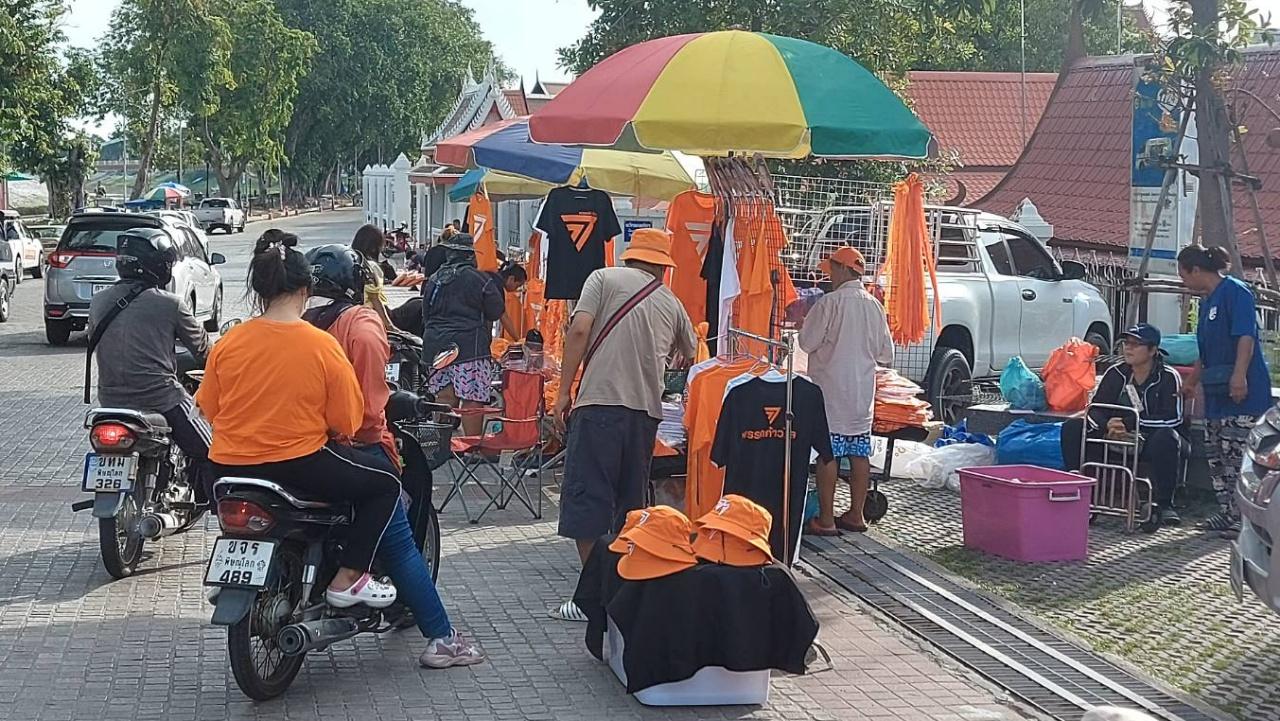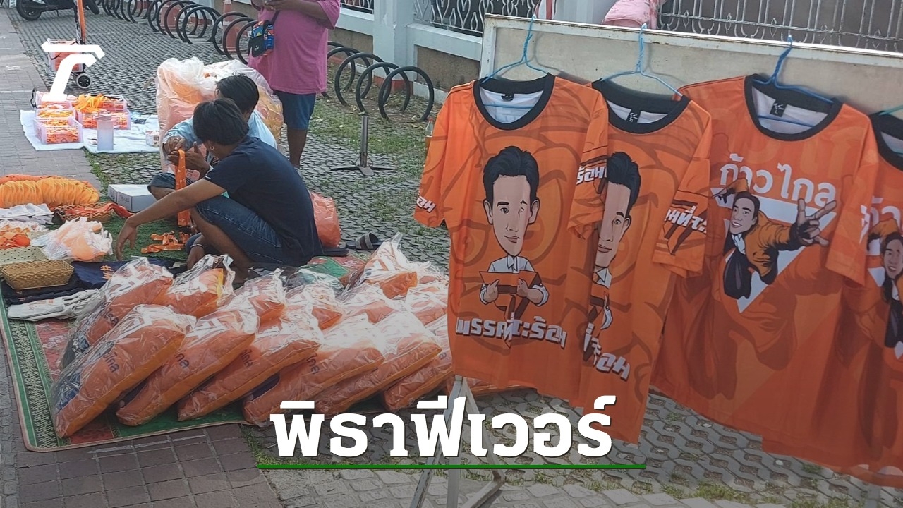 แม่ค้ามาไกลจากกรุงเทพฯ นำสินค้า เสื้อผ้า หมวก ที่ระลึก ติดโลโก้พรรคก้าวไกล มาวางจำหน่ายริมถนนหน้าวัดใหญ่ เมืองพิษณุโลก เนื่องจาก "พิธา ลิ้มเจริญรัตน์" หน.พรรคฯ จะเดินทางมาขอบคุณพี่น้องชาวสองแคววันนี้