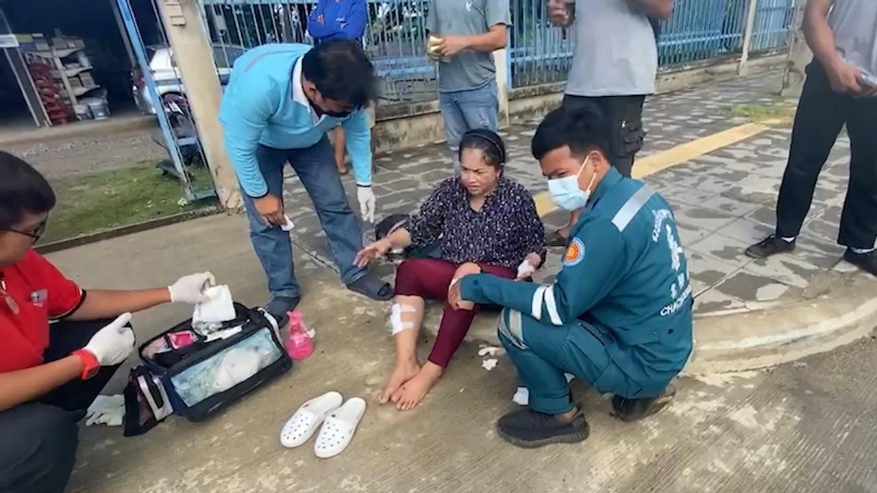 รถกระบะลื่นน้ำฝน ไถลข้ามเลนมาชนเข้ากับรถ จยย.สาวโรงงานกำลังขี่รถกลับบ้าน ร่างไถลไปตามพื้นถนน รถตีลังกา ส่วนรถยนต์หมุนเอาท้ายเข้าไปจอดในร้านขายวัสดุก่อสร้าง คนเจ็บพ้อเมื่อไรจะมาแก้ถนนตรงนี้เสียที