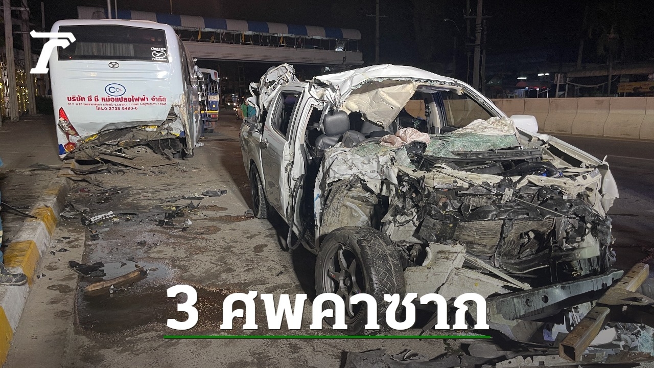 อุบัติเหตุสลดกลางดึก บนถนนพุทธรักษา กลางเมืองสมุทรปราการ กระบะเสียหลักชนท้ายรถบัสจอดข้างทาง ตายคาซาก 3 ศพ คนเห็นเหตุการณ์เผยกระบะขับมาเร็ว เหินสะพานข้ามคลอง จนเสียการทรงตัว