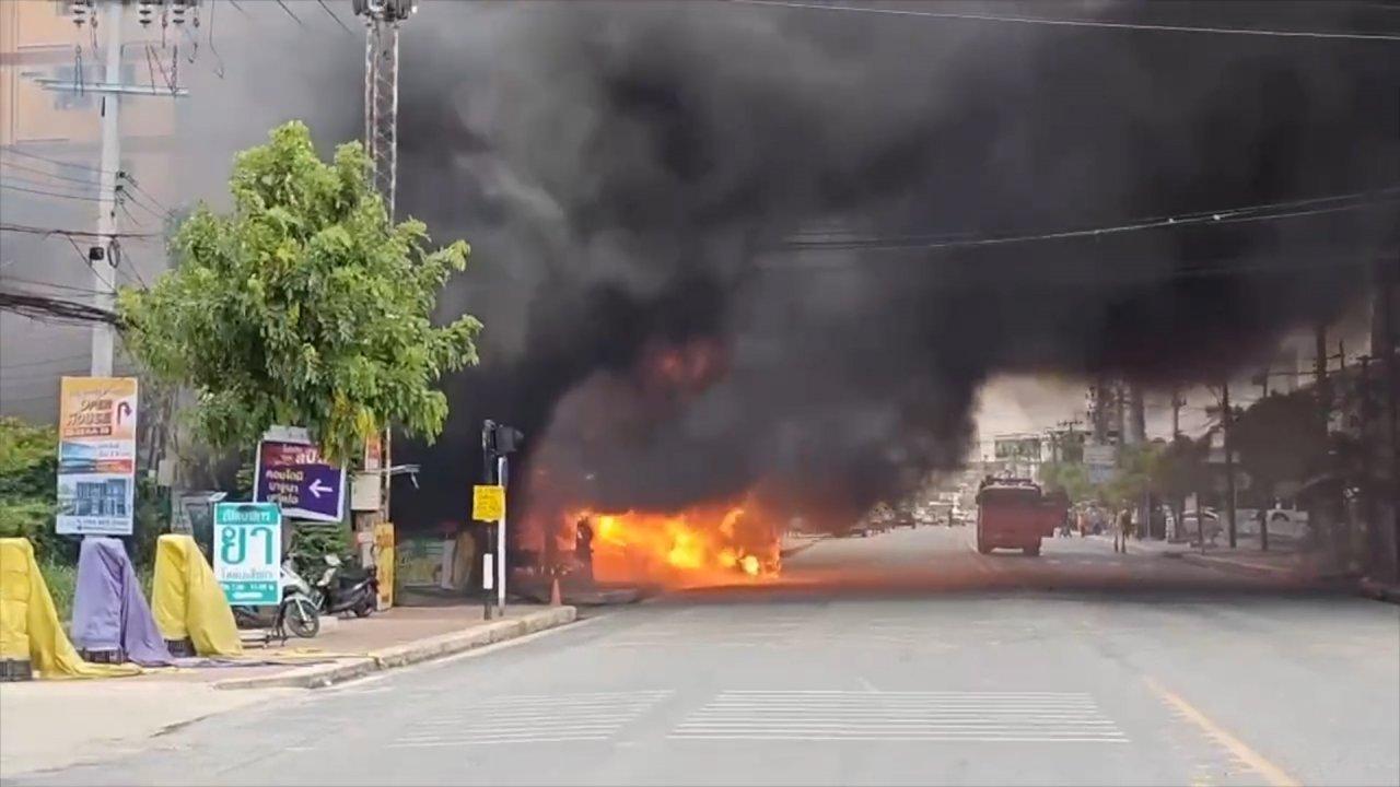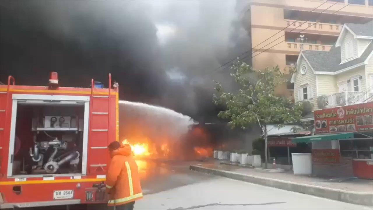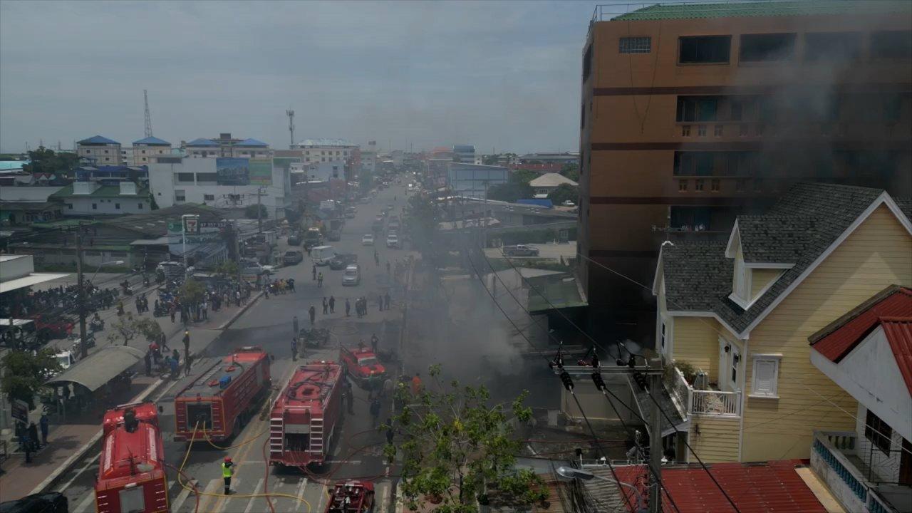 จากคลิปวิดีโอที่บันทึกได้ จะเห็นว่ามีชายเจ้าของร้านพยายามขนถังแก๊สภายในร้านออกจากร้านอย่างเร่งด่วน จากนั้นไม่ถึงห้านาทีต่อมา เพลิงลุกลามติดร้านค้าข้างเคียงที่ปลูกติดกันหลายหลังจากนั้นไม่กี่นาทีต่อมาเพลิงลุกโหมลามเข้าหอพักแบ่งให้เช่าสูง 5 ชั้น อย่างรวดเร็ว ท่ามกลางกลุ่มควันสีดำและเสียงระเบิดดังเป็นระยะ หลังเกิดเหตุไม่นาน เจ้าหน้าที่ดับเพลิงจากเทศบาลบางบ่อ และพื้นที่ใกล้เคียงกว่าสิบคัน พร้อมด้วยหน่วยบรรเทาและเจ้าหน้าที่กู้ภัยป่อเต็กตึ๊งต้องระดมกำลังเข้าระงับเหตุและอพยพคนในหอพักดังกล่าว โดยปิดการจราจรเด็ดขาดบนถนนสายรัตนราช ท่ามกลางความแตกตื่นขอผู้เห็นเหตุการณ์ในครั้งนี้