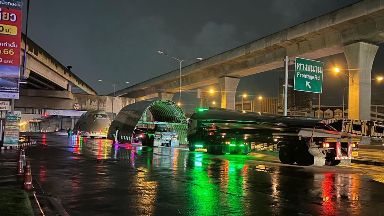 ขบวนรถบรรทุกชิ้นส่วนเครื่องบินโบอิ้ง 747 จากระยองจะไปประกอบวางไว้ในที่ดินส่วนตัวที่ปราณบุรี ติดตอม่อรถไฟฟ้าสายสีม่วงช่วงบางบัวทอง เพราะสูงเกิน ต้องแก้ไขอยู่ร่วมชั่วโมง ด้านรองผอ.แขวงทางหลวงบอกไม่มีใครขออนุญาต เช่นเดียวกับผกก.ยืนยันไม่ได้รับแจ้ง น่าจะแอบขนกันเอง
