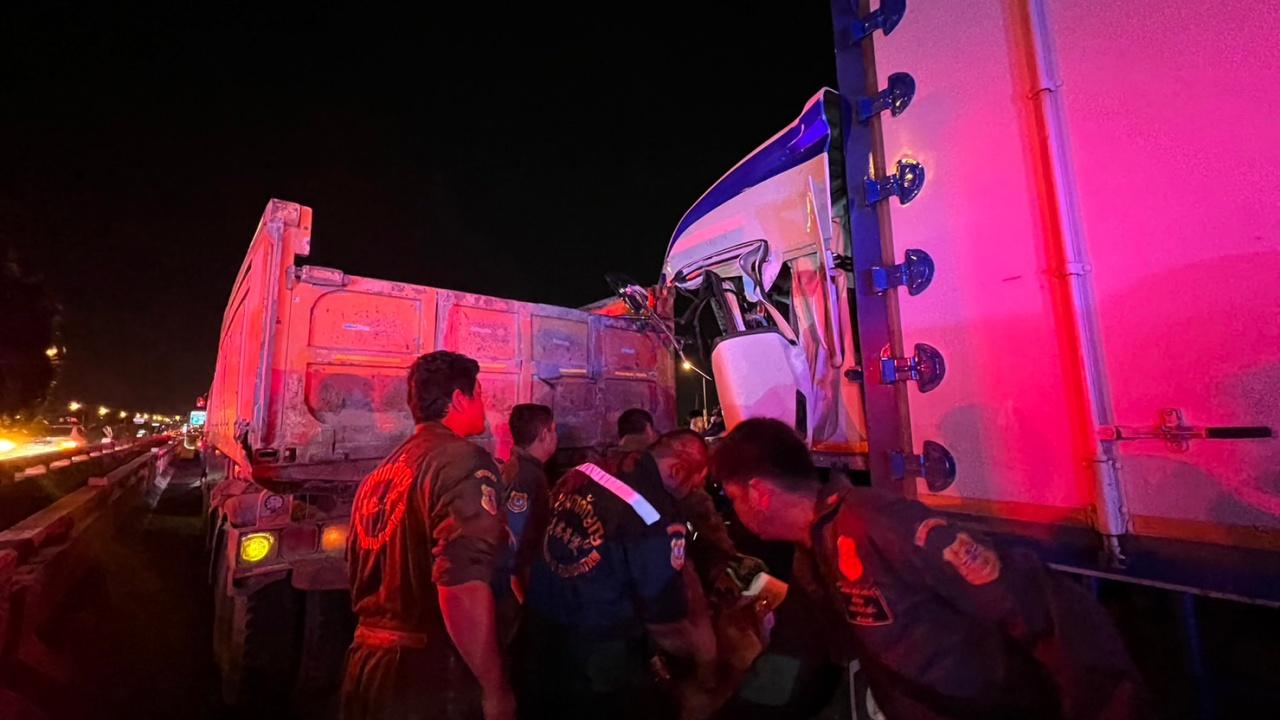เวลา 21.00 น. วันที่ 14 ส.ค. 66 เจ้าหน้าที่ตำรวจ สภ.บางบัวทอง จ.นนทบุรี พร้อมเจ้าหน้าที่มูลนิธิร่วมกตัญญูเดินทางไปตรวจสอบหลังจากได้รับแจ้งมีรถบรรทุก 6 ล้อชนท้ายรถบรรทุกพ่วง 22 ล้อมีผู้บาดเจ็บติดอยู่ในรถ เหตุเกิดบนสะพานข้ามคลองพระพิมล ถนนกาญจนาภิเษกขาเข้า ต.บางบัวทอง อ.บางบัวทอง