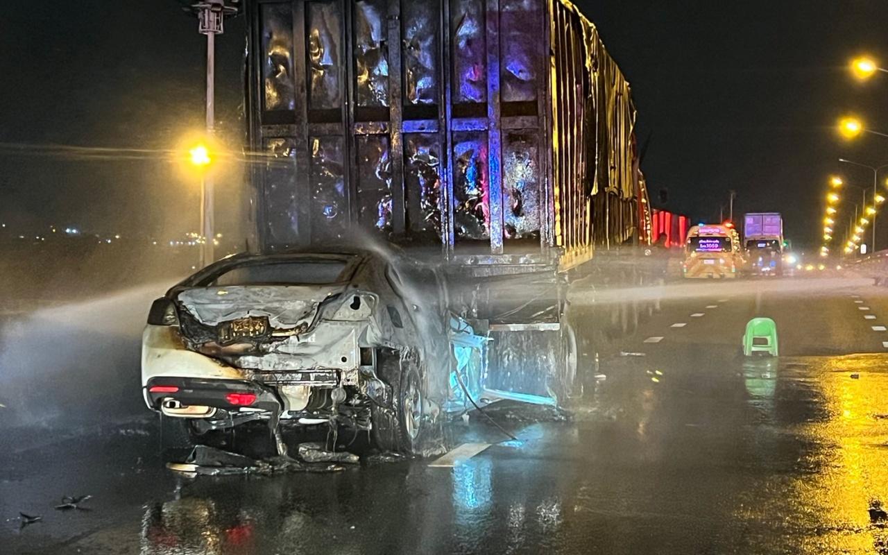 ในที่เกิดเหตุพบรถเก๋งยี่ห้อเอ็มจี สีขาว หมายเลขทะเบียน พศ 3468 กทม.ชนอัดคาท้ายรถพ่วง 22 ล้อ หมายเลขทะเบียน 70-2475 นครปฐม โดยเกิดเปลวไฟลุกท่วมทั้งคัน มีเจ้าหน้าที่ดับเพลิงเทศบาลตำบลบางพลับ นำรถน้ำกำลังช่วยกันฉีดดับไฟ ใช้เวลาราว 20 นาที สามารถควบคุมเพลิงไว้ได้ หลังเพลิงสงบตรวจสอบพบร่างผู้เสียชีวิต เพศชายถูกไฟไหม้เกรียม ติดอยู่ในรถคาที่นั่งคนขับ โดยมีนายสาย กวงนิล อายุ 42 ปี ชาว จ.ขอนแก่น คนขับรถพ่วง รอให้ปากคำกับตำรวจ