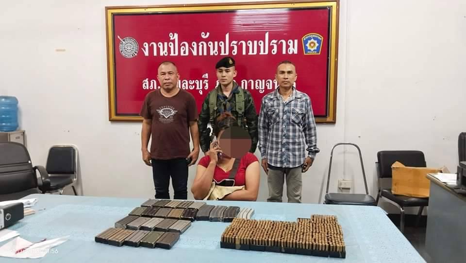 ตร.สังขละบุรี รวบสาวมอญพร้อมปลอกกระสุน M-16 เกือบ 1,000 ปลอก แมกกาซีน 24 อัน พบส่งทางพัสดุ ต้นทางมาจากชลบุรี อ้างมีคนมาไว้หน้าบ้าน จึงนำมาไว้ที่บ้านจนมาถูกจับตัว จนท.ไม่ปักใจเชื่อ จึงนำตัวมาสอบสวนเพื่อขยายผล ก่อนแจ้งข้อหา