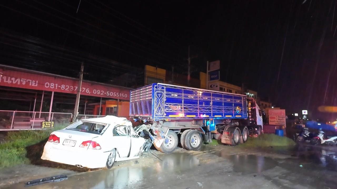 หนุ่มพันตรี ขับเก๋งกลับบ้าน ระหว่างทางเกิดเหตุฝนตกหนัก รถเสียหลักพุ่งชนรถพ่วง 18 ล้อจอดอยู่ข้างทางอย่างแรง เสียชีวิตคาที่ร่างติดในรถ กู้ภัยต้องตัดถ่างนำศพออกมา
