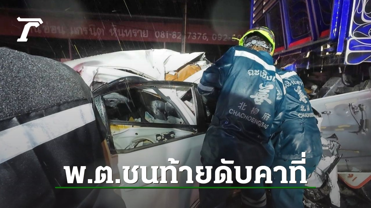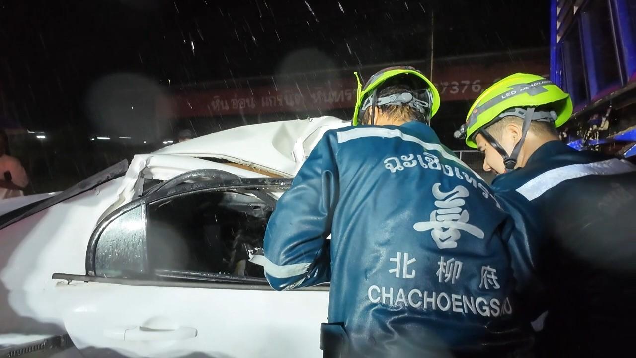 เจ้าหน้าที่กู้ภัยฉะเชิงเทรารับคำสั่งจากพนักงานสอบสวนให้ใช้อุปกรณ์ตัดถ่างตัดซากรถที่กดทับร่างผู้เสียชีวิตในขณะที่ฝนตก โดยพนักงานสอบสวนจะรวบรวมพยานหลักฐานเพื่อหาเหตุผลของการเกิดอุบัติเหตุที่แท้จริงอีกครั้ง โดยร่างผู้เสียชีวิตหน่วยกู้ภัยฉะเชิงเทรานำส่งเก็บรักษาที่ รพ.พุทธโสธร