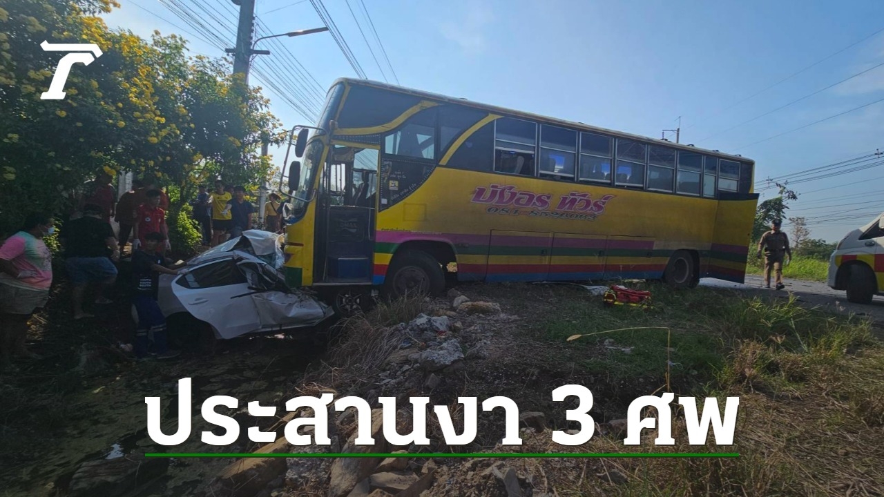 4 ชีวิตขับเก๋ง คร่อมเลนพุ่งประสานงารถบัสรับส่ง พนง. ไถลลงข้างทางอัดยับเป็นซาก สลดเก๋งตาย 3 สาหัส 1 ส่วนรถบัส พนักงานร้องโอดโอยเจ็บระนาว