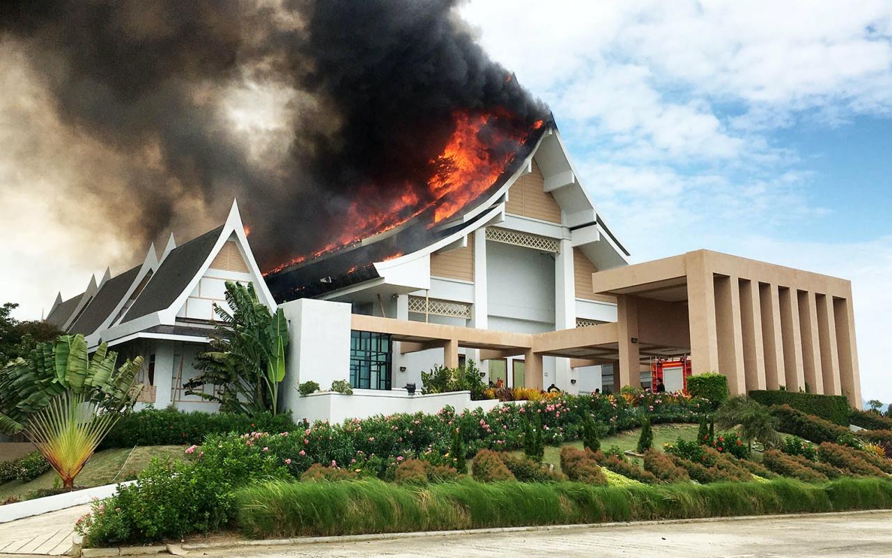 พบอาคารขนาดใหญ่สีขาว เป็นตึก 4 ชั้น เพลิงกำลังลุกไหม้บนหลังคาเป็นควันโขมง มีอาจารย์ และเจ้าหน้าที่มหาวิทยาลัย เก็บของหนีไฟกันอย่างจ้าละหวั่น เจ้าหน้าที่เร่งฉีดน้ำดับไฟอย่างเร่งด่วน เนื่องจากมีลมแรง กลัวจะลุกลาม ใช้เวลาประมาณ 1 ชั่วโมง จึงสามารถควบคุมเพลิงได้โดยไม่มีใครได้รับบาดเจ็บ