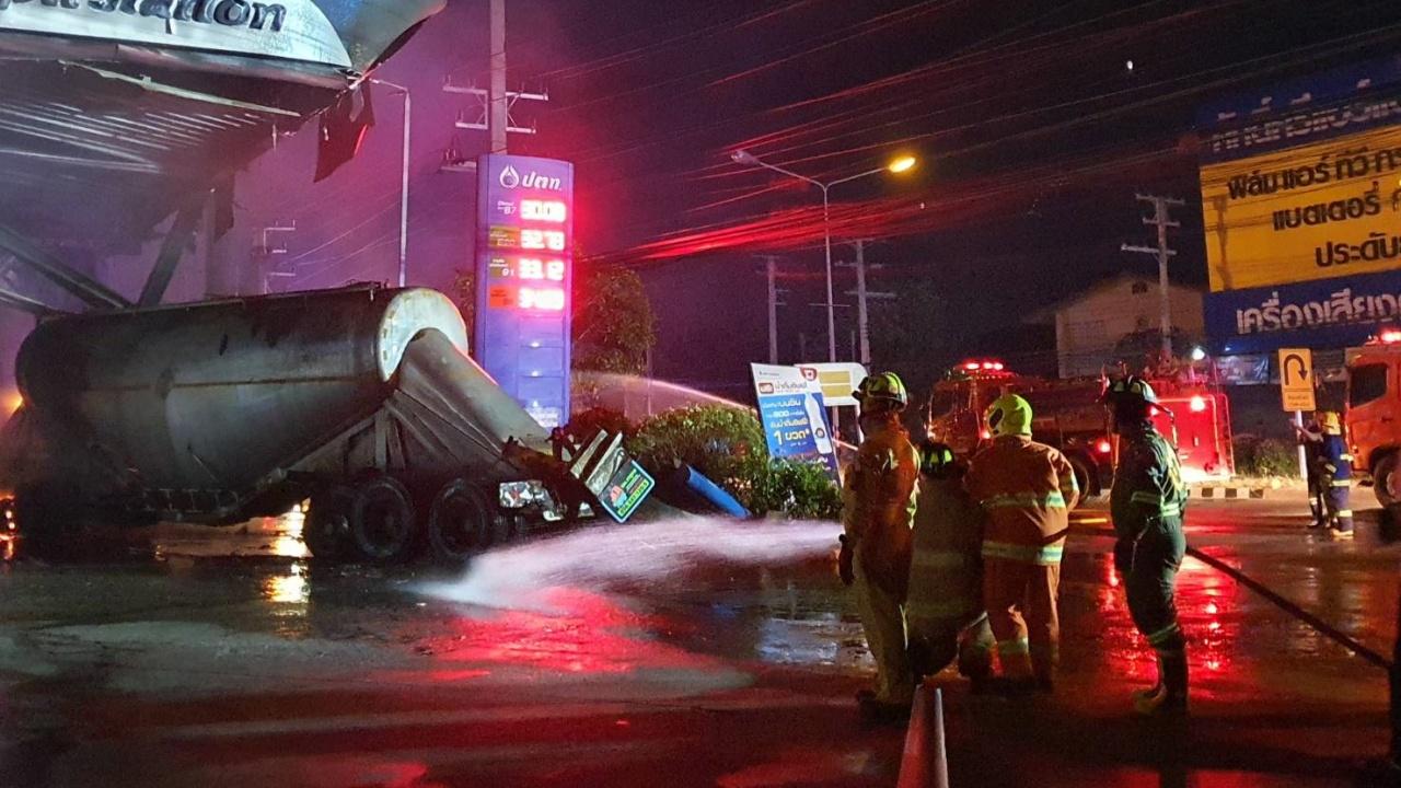 ที่เกิดเหตุพบไฟกำลังโหมลุกไหม้ปั๊มอย่างรุนแรง เนื่องจากถูกรถบรรทุกพุ่งชนหัวจ่ายน้ำมัน เจ้าหน้าที่การไฟฟ้าจึงเร่งทำการตัดกระแสไฟในจุดเกิดเหตุ เพื่อให้เจ้าหน้าที่ดับเพลิงช่วยกันระดมฉีดน้ำสกัดเปลวเพลิง เพื่อไม่ให้ลุกลามขยายเป็นวงกว้าง นอกจากนี้เจ้าหน้าที่ยังปิดเส้นทางจราจรทั้ง 2 เส้นทาง เพื่อป้องกันอันตราย เนื่องจากในพื้นที่เกิดเหตุยังมีเสียงระเบิดดังลั่นออกมาจากปั๊มน้ำมัน