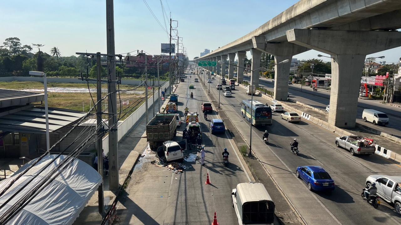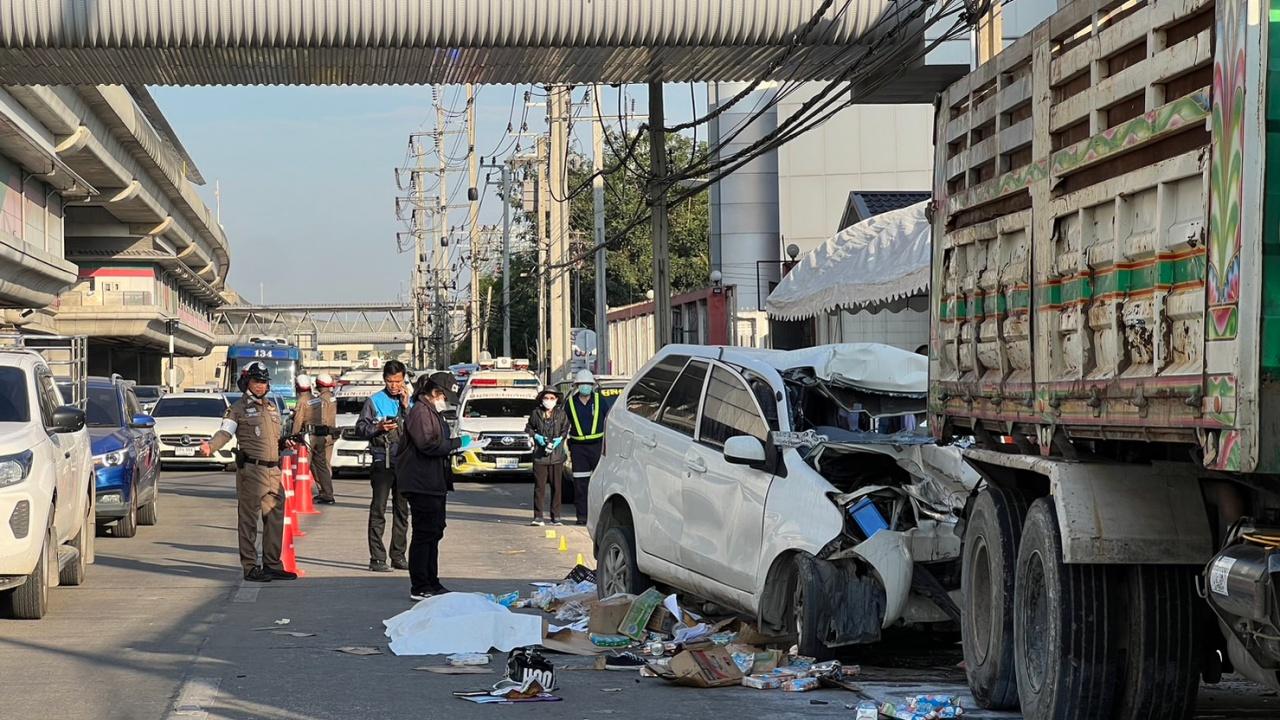 เวลา 15.00 น. วันที่ 27 ธ.ค. 66 ร.ต.ท.สคุณ เครือคำ รอง สว.สอบสวน สภ.บางบัวทอง จ.นนทบุรี รับแจ้งมีอุบัติเหตุรถเก๋งชนท้ายรถบรรทุก 10 ล้อมีผู้เสียชีวิต 2 ราย เหตุเกิดใต้สถานีรถไฟฟ้า MRT บางรักใหญ่ ถนนรัตนาธิเบศร์ขาออก ต.บางรักใหญ่ อ.บางบัวทอง จ.นนทบุรี จึงพร้อมด้วยแพทย์เวรจากสถาบันนิติวิทยาศาสตร์ และเจ้าหน้าที่มูลนิธิป่อเต็กตึ๊ง เดินทางเข้าตรวจสอบที่เกิดเหตุ