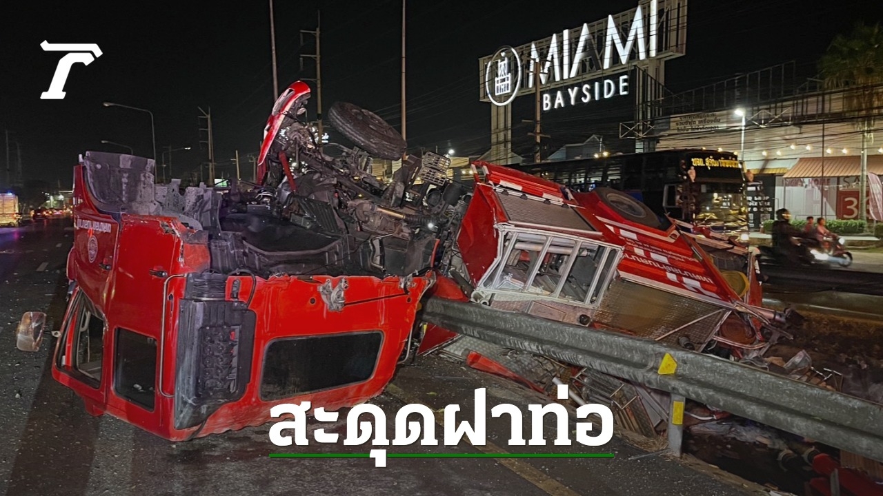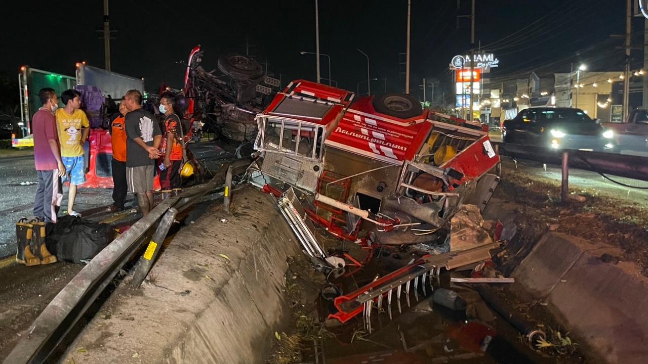 รถดับเพลิงเทศบาลบางปู สมุทรปราการ เร่งไปที่เกิดเหตุเพลิงไหม้ เกิดอุบัติเหตุพลิกคว่ำลงร่องกลางถนนคนขับบาดเจ็บ พบสาเหตุจากไปสะดุดฝาท่อพักสายไฟฟ้า รถหนักบรรทุกน้ำมา 5 พันลิตร เสียหลักคนขับไม่สามารถควบคุมได้
