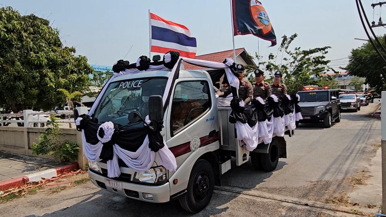 ต่อมาเวลา 12.30 น. พล.ต.ต.สมภพ คูหาวิชานันท์ ผบก.ภ.จว.สมุทรสงคราม, พ.ต.อ.เพชรกล้า ทวีกาญจน์ ผกก.สภ.อัมพวา นำข้าราชการตำรวจจัดแถวตำรวจกองเกียรติยศ โดยมี นายเกียรติยศ บุตรชายคนโต ถือกระถางธูป, น.ส.ไพเราะ ภรรยา ถือรูปภาพ นำศพลงจากรถตู้ส่งศพจากโรงพยาบาลตำรวจมาคลุมด้วยธงชาติ และขึ้นบนแท่นในรถเกียรติยศ โดยมีข้าราชการตำรวจนั่งประคองด้านข้าง ด้านละ 3 นาย และเคลื่อนขบวนจากกองบังคับการตำรวจภูธรจังหวัดสมุทรสงคราม เพื่อนำไปประกอบพิธีทางศาสนาที่วัดหัวโพ ต.หัวโพ อ.บางแพ จ.ราชบุรี