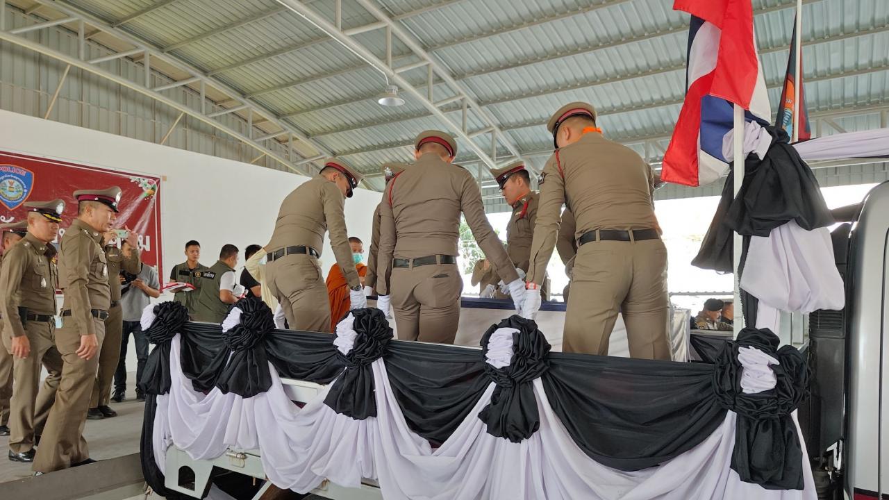 ล่าสุดเมื่อช่วงเช้าวันที่ 12 ก.พ. 67 น.ส.ไพเราะ สายแสง อายุ 44 ปี ภรรยา พร้อมด้วย นายเกียรติยศ ฮวยแหยม อายุ 24 ปี บุตรชายคนโต และญาติ ได้นิมนต์ พระปลัดสมศักดิ์ อัตตสุโภ ผู้ช่วยเจ้าอาวาสวัดบางกะพ้อม เคลื่อนย้ายศพจากโรงพยาบาลตำรวจ มาจัดแถวกองเกียรติยศ ที่กองบังคับการตำรวจภูธรจังหวัดสมุทรสงครามอย่างสมเกียรติ