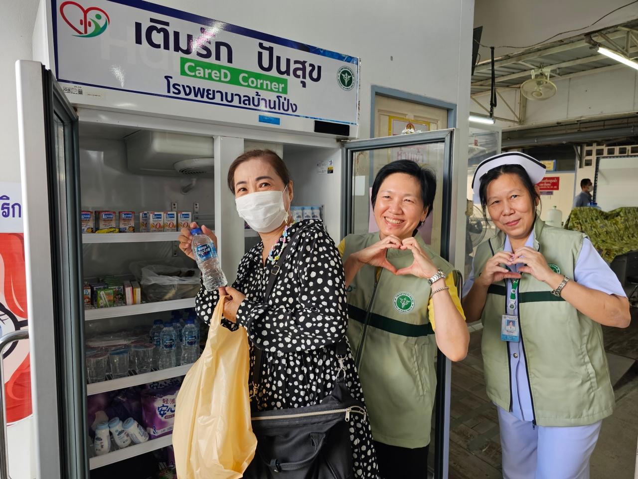 ราชบุรี-แพทย์ พยาบาล เจ้าหน้าที่โรงพยาบาลบ้านโป่ง และประชาชนทั่วไป นำอาหาร เครื่องดื่ม นม และของใช้ที่จำเป็นสำหรับผู้ป่วย มาใส่ไว้ใน “ตู้เติมรัก ปันสุข” CareD Corner พร้อมติดป้ายข้อความ “ฟรีทุกอย่าง หยิบได้ เติมได้” บริการตลอด 24 ชั่วโมง โดยได้รับความสนใจจากประชาชนที่เดินทางมารับบริการของทางโรงพยาบาลเป็นอย่างมาก