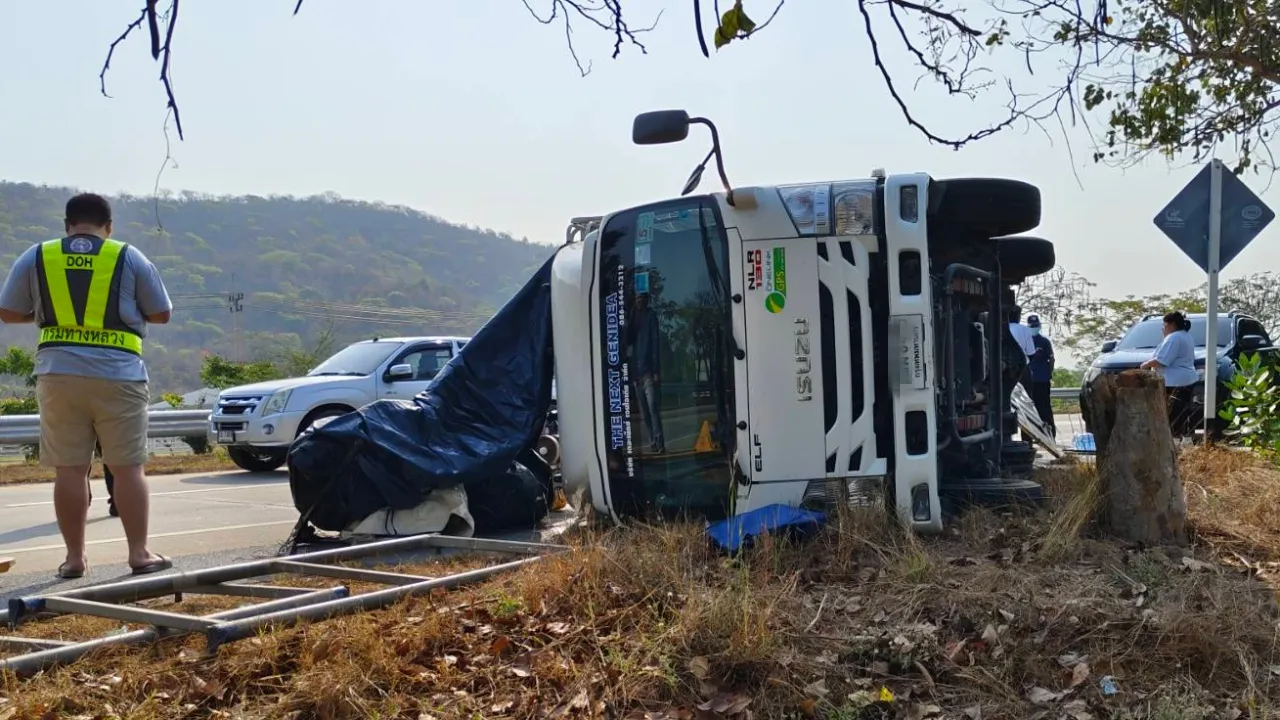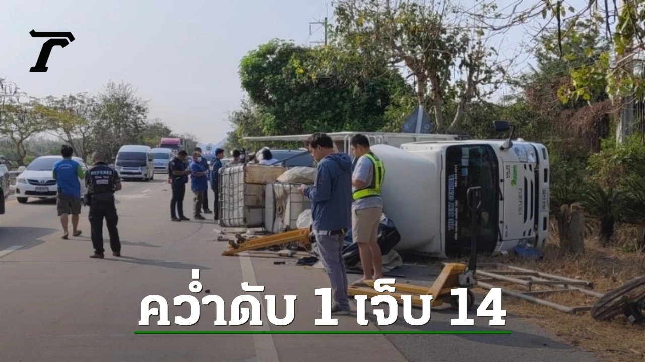 รถขนคนงานไปตั้งเต็นท์ ยางแตกพลิกคว่ำเทกระจาด ดับ 1 บาดเจ็บ 14 คนขับเชื่อบารมีหลวงพ่อเปิ่นคุ้มครอง ทำให้ตัวเองรอดปลอดภัย บาดเจ็บเพียงเล็กน้อย
