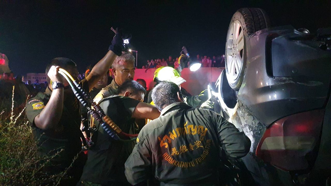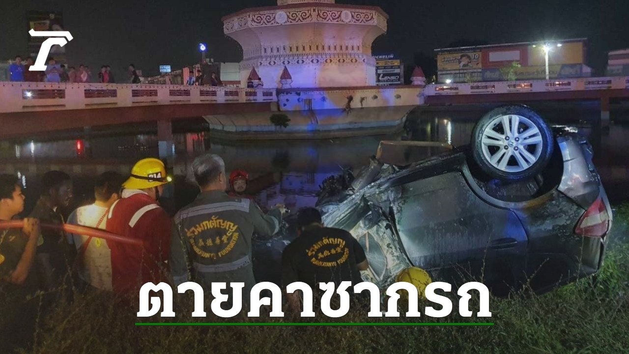 หนุ่มสระบุรีซิ่งเก๋งพุ่งชนวงเวียนศรีสุริโยทัย ล้อระเบิดหลุดกระเด็น ชิ้นส่วนกระจาย ไฟลุกท่วม ก่อนจะเหินตก คนขับติดซากรถถูกคลอกดับอนาถ