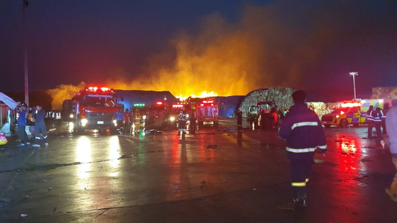 เกิดไฟไหม้ขยะอัดก้อน กองไว้หลังโรงงานรีไซเคิลที่สมุทรสาคร ลุกไหม้กระดาษเก่า 3 กอง เป็นเชื้อไฟอย่างดี ยังไม่สามารถดับไฟได้ ต้องใช้แบ็กโฮตักคุ้ยกองกระดาษ เพื่อให้ฉีดน้ำลงไปถึงด้านล่าง
