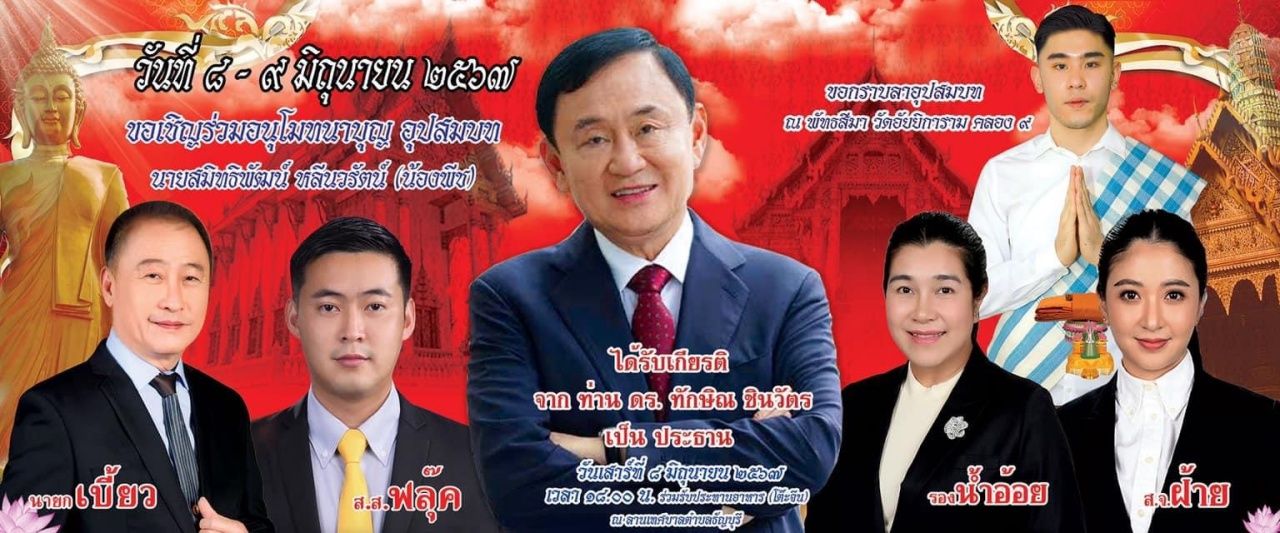 วันที่ 17 พฤษภาคม 2567 ผู้สื่อข่าวรายงานว่า ที่เทศบาลตำบลธัญบุรี (คลอง 7) ต.ลำผักกูด อ.ธัญบุรี จ.ปทุมธานี กำลังเตรียมจัดงานใหญ่ โดยมี อดีตนายกฯ ทักษิณ ชินวัตร ให้เกียรติมาเป็นประธานงานเลี้ยงฉลองบวชหลานชายนายกเทศมนตรีตำบลธัญบุรี ในวันเสาร์ที่ 8 มิถุนายน 2567 เวลา 18.00 น.