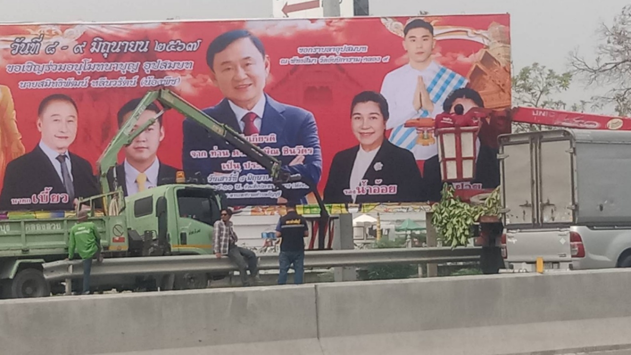 มาแน่ เทศบาลธัญบุรี ตั้งป้ายใหญ่ริมถนนอดีตนายกฯ ทักษิณ เป็นประธานงานบวชหลาน “นายกเบี้ยว” นายกเทศมนตรี จับตาขึ้นเวทีพร้อม “ชาญ พวงเพ็ชร์”
