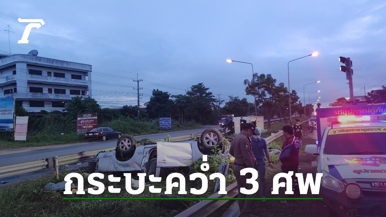 "นครปฐม" กระบะ 2 คัน วิ่งตามกันมา เสียหลักพลิกคว่ำ เจ็บ 3 ตาย 3 ศพ ตำรวจเผยขณะเกิดเหตุมีฝนตกลงมา อาจเป็นสาเหตุทำให้ถนนลื่น