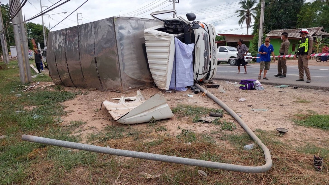 รถหกล้อโรงน้ำแข็งจากราชบุรี วิ่งส่งร้านค้าใน อ.ปากท่อ เสียหลักพลิกคว่ำไถลไปฟาดเสาไฟฟ้าริมถนน เสียชีวิตทั้งคัน ทั้งคนขับคนงานแบกน้ำแข็ง ดับคาที่ 3 ศพ