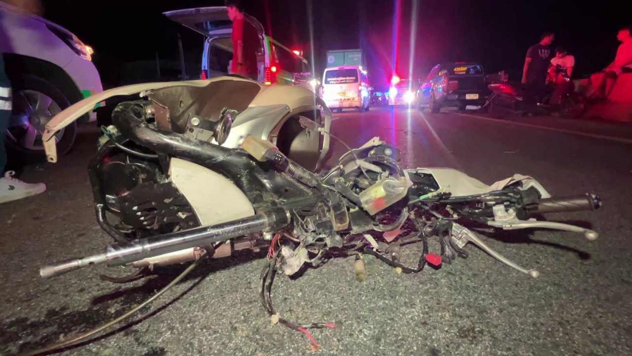 ห่างออกไปเล็กน้อยพบซากรถจักรยานยนต์ ฮอนด้า สีน้ำตาลอ่อน หมายเลขทะเบียน 1กว 4842 ฉะเชิงเทรา เป็นของ นายภานุวัฒน์ อายุ 19 ปี ถูกรถบรรทุกพ่วงทับที่ศีรษะ เสียชีวิต โดยมีพ่อและแม่นั่งร้องไห้กอดศพ ส่วนรถจักรยานยนต์อีกคันยี่ห้อฮอนด้า สีขาว หมายเลขทะเบียน 7ขฆ 976 กรุงเทพมหานคร กระเด็นตกลงไปอยู่ในป่าหญ้าข้างทาง สภาพด้านหน้าพังยับ เป็นของนายธนากร อายุ 23 ปี นอนเสียชีวิตข้างนายภานุวัฒน์ สภาพศพศีรษะแตก มันสมองกระจายเต็มพื้นถนน เบื้องต้น แพทย์นิติเวชได้ให้เจ้าหน้าที่กู้ภัยนำส่งโรงพยาบาลพุทธโสธร ทำการชันสูตร