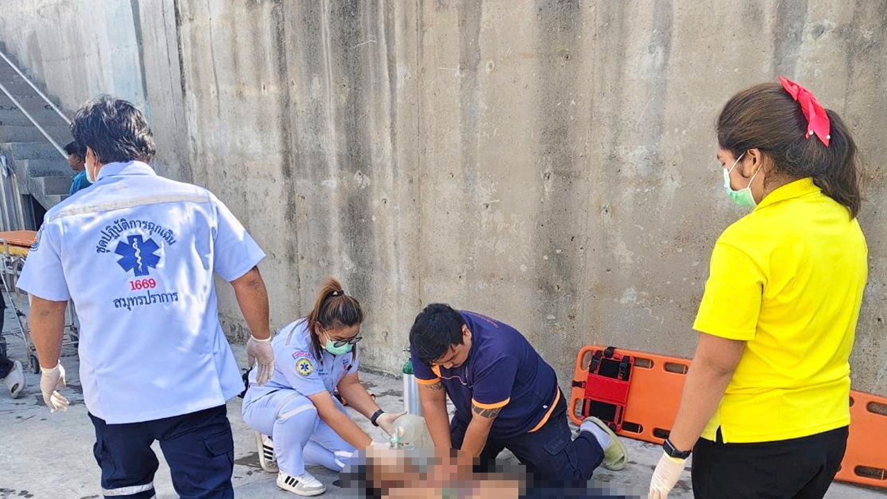 กู้ภัยพยายามปั๊มหัวใจแรงงานชาวเมียนมา ลงไปซ่อมบ่อบำบัดน้ำเสียโรงงานฟอกหนัง ต.บางปูใหม่ อ.เมืองสมุทรปราการ สูดแก๊สพิษหมดสติก้นบ่อ 4 ราย สุดท้ายยื้อไม่ไหวเสียชีวิต 1 ศพ สาหัส 1 ราย ส่วนอีก 2 รู้สึกตัวแล้ว.