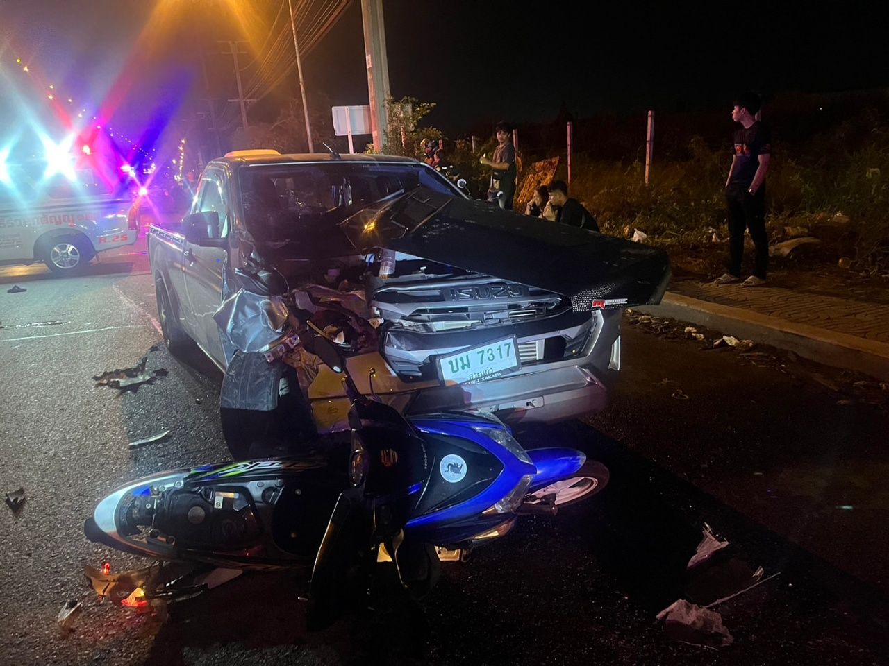 กระบะเสยท้าย จยย. สาวเพิ่งกลับจากงานเลี้ยงวันเกิดเพื่อนดับ แฟนหนุ่มสาหัส คนขับอ้างถูกตัดหน้ากระชั้นชิด เบรกไม่ทัน