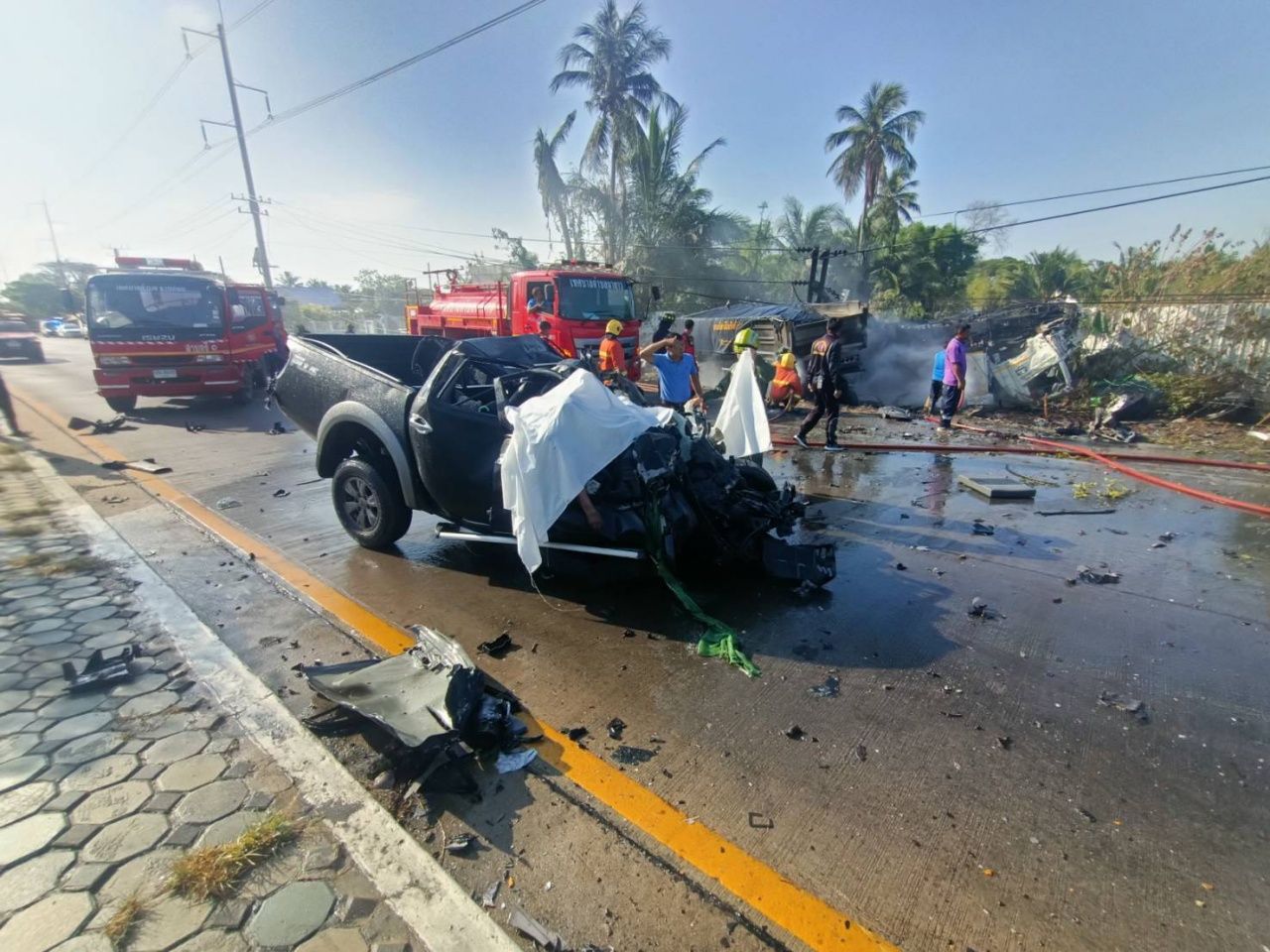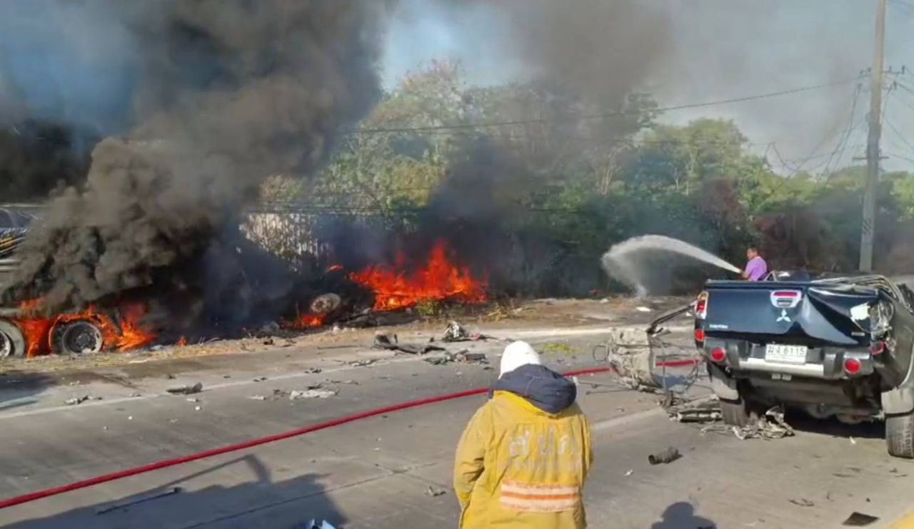 เกิดเหตุรถบรรทุกเสียหลักพุ่งข้ามเกาะชนกระบะ พ่อแม่ลูกดับ ก่อนรถตกข้างทางไฟลุกไหม้ ที่สระบุรี คนขับเจ็บ