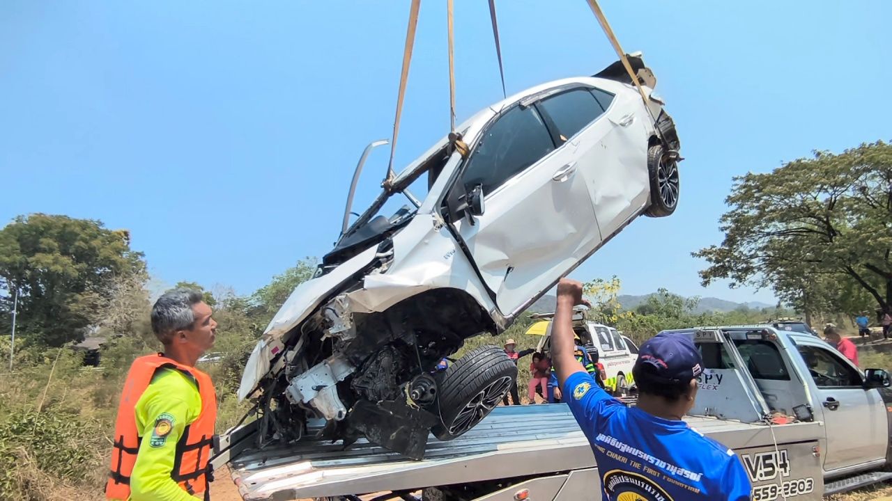 ต่อมาเวลา 12.30 น. เจ้าหน้าที่กู้ภัยสามารถกู้ซากรถเก๋ง โตโยต้าอัลติส สีขาว ทะเบียนชุมพร ขึ้นมาจากน้ำได้ โดยมีสภาพพังยับ จากการตรวจสอบไม่พบใครติดอยู่ภายในซากรถ