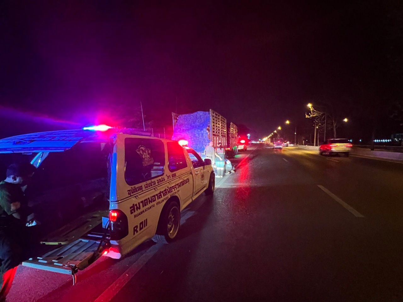 ที่เกิดเหตุ พบรถบรรทุกพ่วง ยี่ห้อ อีซูซุ ส่วนหัวหมายเลขทะเบียนลำกำแพงเพชร บรรทุกไม้ซุงเต็มคันรถ โดยรถจอดอยู่ริมถนนด้านซ้ายสุด มีนายวิรัตน์ ปานน้อย อายุ 39 ปี เป็นคนขับ ด้านท้ายพ่วงมีรถจักรยานยนต์พุ่งชน ได้รับความเสียหายทั้งคัน