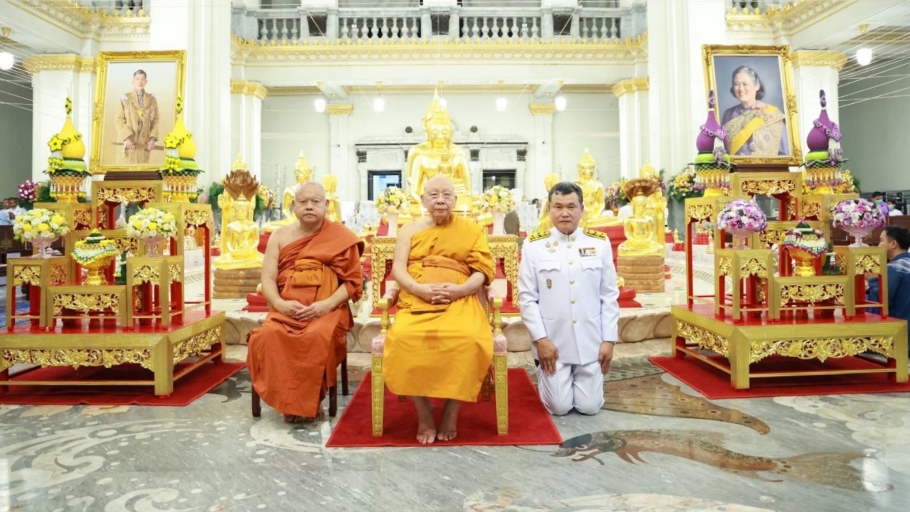 เจ้าหน้าที่อัญเชิญผ้าไตรพระราชทานเบื้องหน้าพระบรมฉายาลักษณ์พระบาทสมเด็จพระเจ้าอยู่หัว เพื่อเชิญไปถวายแด่สมเด็จพระมหาธีราจารย์ เจ้าคณะใหญ่หนเหนือ เจ้าอาวาสวัดพระเชตุพนวิมลมังคลาราม ประธานสงฆ์