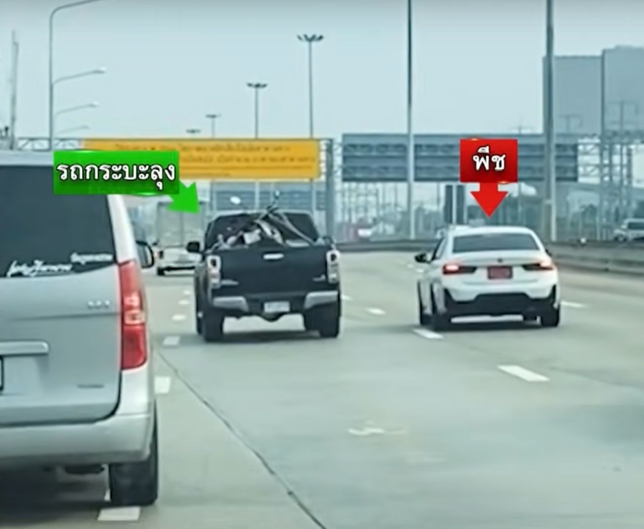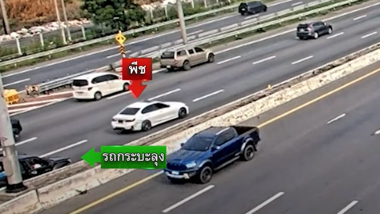 ด้าน นายพีช เผยว่า คลิปต้นเรื่องที่ออกจากด่านมาแล้วนั้น ยืนยันกระบะได้เบียดเข้ามา จนทำให้รถของตนไปครูดกับแบริเออร์ จนเป็นรอย ซึ่งตนชะลอแล้ว และเริ่มหยุดเพราะชนแล้ว ขับมาไม่ได้เร็วมาก ประมาณ 80-100 กม./ชม. เท่านั้น ซึ่งตอนนั้นยอมรับ เราไม่คิดว่าคุณลุงจะขับรถเบี่ยงมาทางเลนของตนเลย คิดว่าเขาจะขับไปตามเลนของเขา ก่อนที่เขาจะกลับไปอยู่ในเลนของตัวเอง