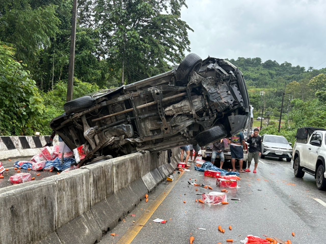 ที่เกิดเหตุพบรถยนต์ยี่ห้ออีซูซุ สีบรอนซ์ โดนรถบรรทุก 12 ล้อ อัดก๊อบปี้พังเสียหายเละทั้งคัน มีคนติดในรถทั้งหมด 6 คน ในจำนวนนี้เสียชีวิต 3 ราย นอกจากนี้ ยังพบรถกระบะคอกอีก 4 คัน ซึ่งบรรทุกของมาเต็มคันรถ ได้รับความเสียหาย เจ้าหน้าที่จึงเร่งนำตัวผู้บาดเจ็บทั้งหมดส่งโรงพยาบาลสังขละบุรีเพื่อทำการรักษา