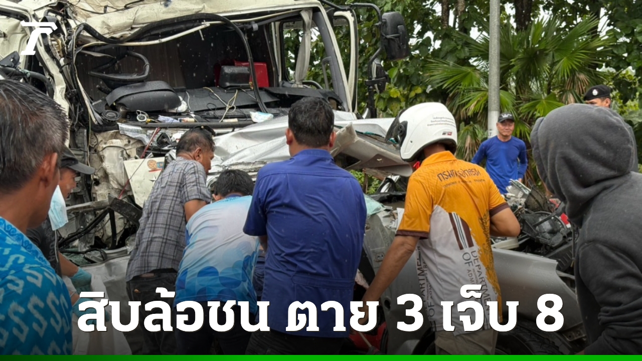 รถบรรทุกสินค้าเบรกไม่อยู่ ชนวินาศสันตะโร เสียหาย 6 คัน ที่เนิน 100 ศพ อ.สังขละ กาญจนบุรี พบผู้เสียชีวิต 3 ศพ เจ็บอีก 8 ราย เจ้าหน้าที่เร่งนำตัวส่งโรงพยาบาลรักษา