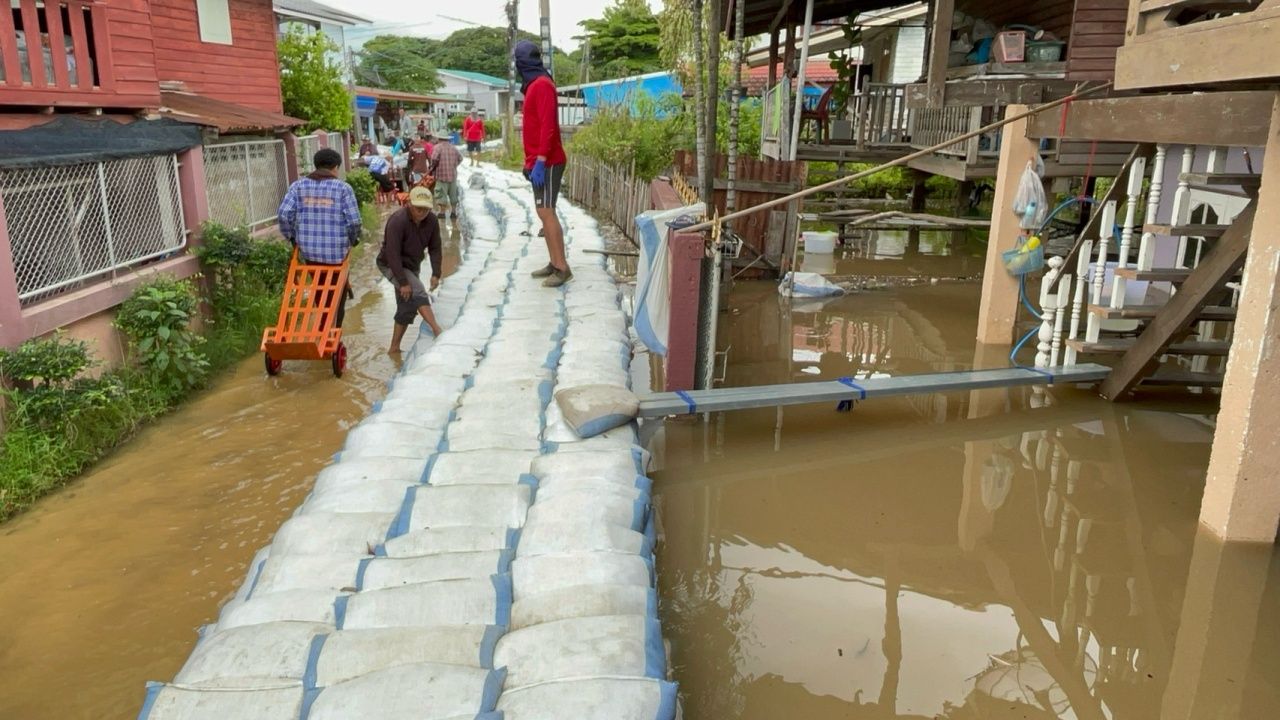 ระดับน้ำท้ายเขื่อนเจ้าพระยา ต่ำกว่าตลิ่งไม่ถึงเมตร เริ่มซึมตามกระสอบทราย ไหลเข้าท่วมบ้านเรือนประชาชน นายกเล็กยัน สู้ถึง 2,500 ลบ.ม./วินาที ขอเขื่อนฯ ทยอยปล่อยน้ำ จะได้มีเวลาเตรียมรับมือ