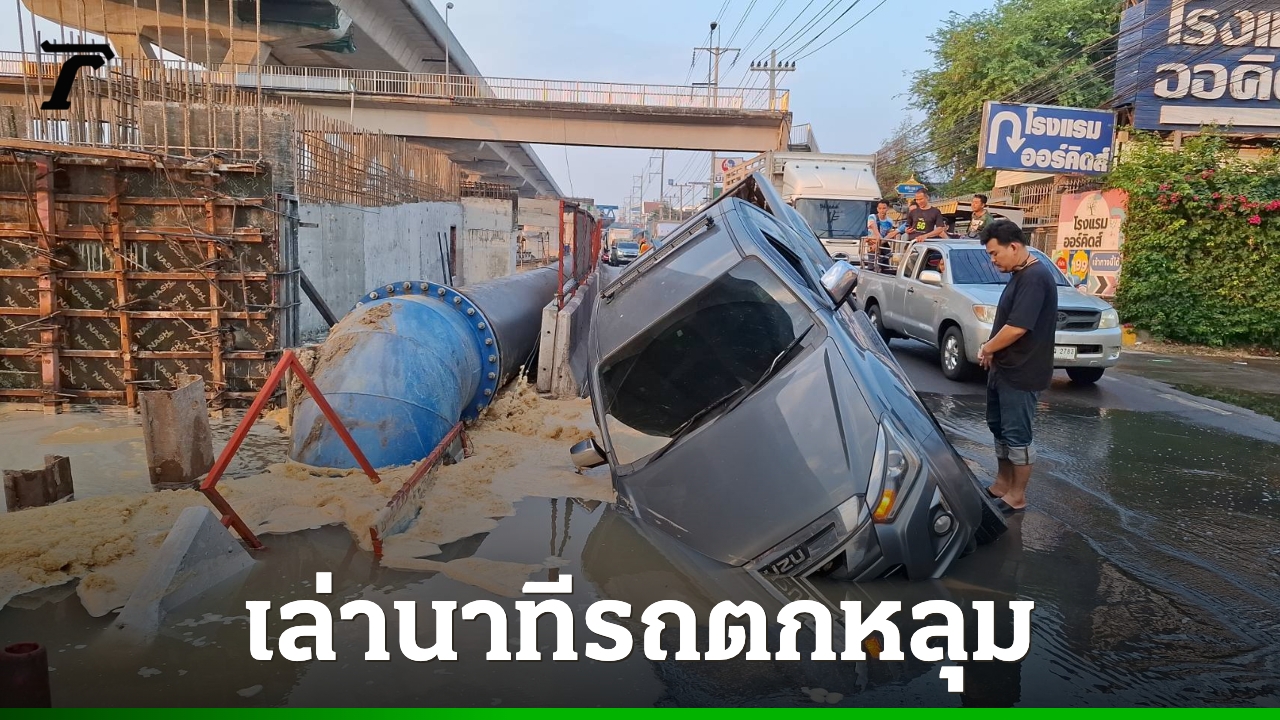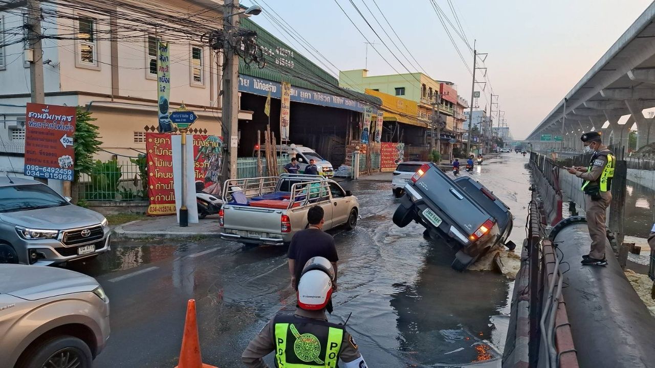 คนขับกระบะเล่านาที รถตกหลุมยุบ ถนนพระราม 2 ฝั่งขาเข้ากรุงเทพฯ ห่างจากจุดเครมถล่ม 1 กม. พบท่อส่งน้ำประปาขนาดใหญ่แตก กระทบน้ำประปาไม่ไหลวงกว้าง