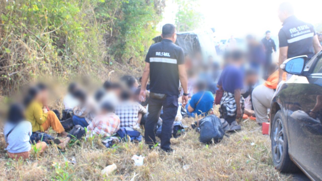 กระบะขบวนการขนแรงงานเถื่อน ซิ่งหนีการจับกุม เสียหลักพลิกคว่ำ เจ็บเกลื่อนถนน ประมาณ 20 ราย พบอัดกันมาเต็มคันรถ เกือบ 40 คน เจ้าหน้าที่เร่งตามตัวคนขับ ขึ้นรถอีกคันหลบหนีไป