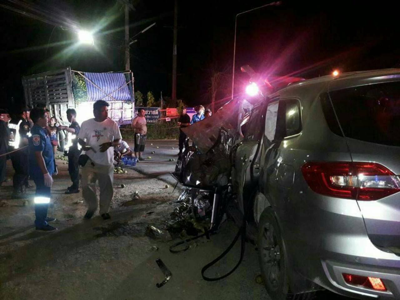 กำนัน ต.ห้วยไผ่ และอดีตผู้ใหญ่บ้าน จ.ราชบุรี ควบฟอร์ดเอเวอร์เรสป้ายแดงกลับจากเลี้ยงงานบวช ขับฝ่าสายฝนมาด้วยความเร็ว อัดท้ายรถบรรทุก 6 ล้อที่ขนมะม่วงมาเต็มคัน เสียชีวิตคาที่ ตร.คาดอาจมองไม่เห็น