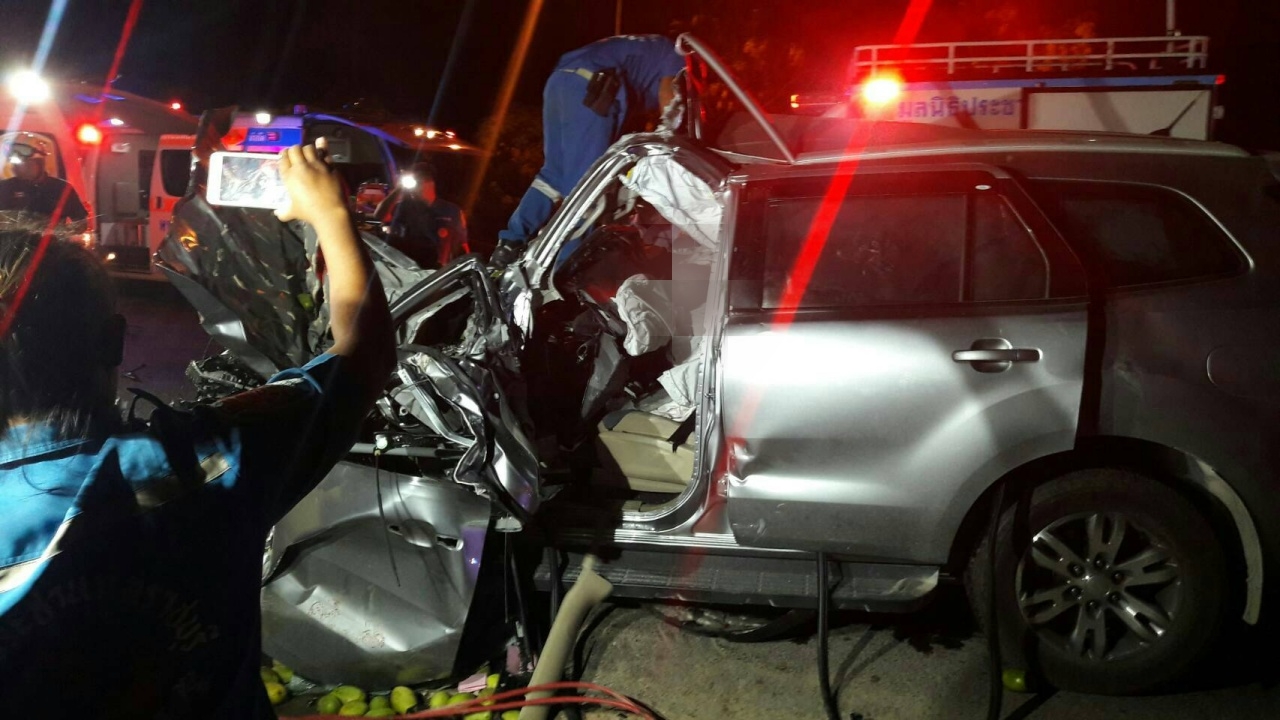 ทั้งนี้ สภาพด้านหน้าพังยับไปจนถึงห้องโดยสาร ถุงลมนิรภัยแตกทั้ง 2 ใบ ด้านหน้ามีผู้เสียชีวิต 2 คน ติดอยู่ภายใน ทราบชื่อต่อมาคือ นายวิเชียร แคร้วคำพุฒ อายุ 59 ปี กำนัน ต.ห้วยไผ่ และนายหล่อ จันทร์แฉล้ม อายุ 64 ปี อดีตผู้ใหญ่บ้านหมู่ที่ 7 ต.ห้วยไผ่ โดยมี นายชาลี พันชารี อายุ 45 ปี คนขับรถบรรทุก 6 ล้อยืนรอให้การเจ้าหน้าที่ตำรวจ