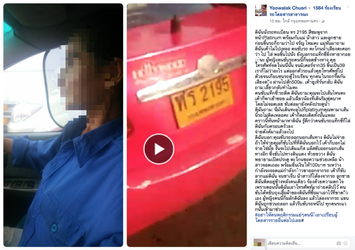 ซึ่งผู้โดยสารสาว โพสต์ข้อความเล่าเหตุการณ์ไว้ว่า “ดิฉันนั่งรถทะเบียน ทร 2195 สีชมพูจากหน้า Platinum พร้อมกับแม่ น้าสาว และลูกชาย ก่อนขึ้นรถก็ถามว่าไป "จรัญไหมคะ" แม่หันมาถามดิฉันเค้าไม่ไปเหรอ คนขับรถ ตะโกนน้ำเสียงตะคอกว่า “ไป" ใส่ พอขึ้นไปนั่งยังบอกรถแท็กซี่ยิ่งหายากอยู่นะ ผู้หญิงคนขับรถคนนี้ก็จอดข้างทาง คุยโทรศัพท์จดโน่นนี่นั่น จนมิเตอร์จาก 35 ขึ้นเป็น 39 เราก็ไม่ว่าอะไร แต่ออกตัวรถแล้วคุยโทรศัพท์ไปด้วยจนเกือบชนรถตู้โรงเรียน ทุกคนในรถกรี๊ดกันเสียงดัง ผ่านไปสัก 500 ม. เค้ายูเทิร์นกลับ