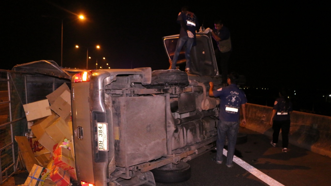 เกิดอุบัติเหตุรถกระบะบรรทุกขนม ยางระเบิดพลิกคว่ำ บนทางด่วนบูรพาวิถี ขวางถนน ก่อนรถตู้ชะลอความเร็ว เพราะกลัวจะชน แต่ถูกรถกระบะที่ขับตามหลังมา อัดท้ายเต็มแรง ทำให้มีผู้ได้รับบาดเจ็บหลายราย
