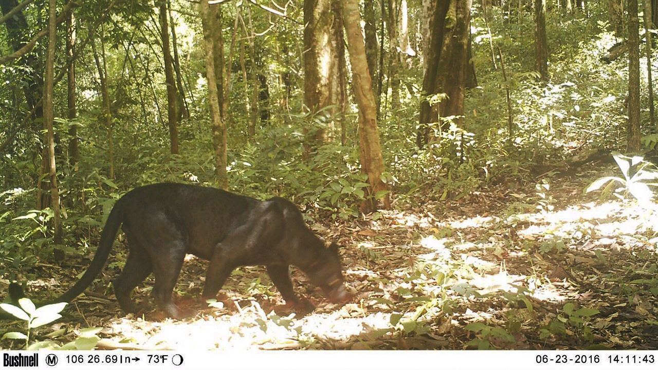 ภาพเสือดำที่ได้จากการตั้งกล้องดักถ่ายภาพประชากรสัตว์ที่บ้านเรดาร์ ต.ปรังเผล อ.สังขละบุรี จ.กาญจนบุรี ในพื้นที่รับผิดชอบของอุทยานแห่งชาติเขาแหลม ซึ่งกรมอุทยานฯ ระบุว่าน่ายินดีที่พบเพราะแสดงถึงระบบนิเวศ.