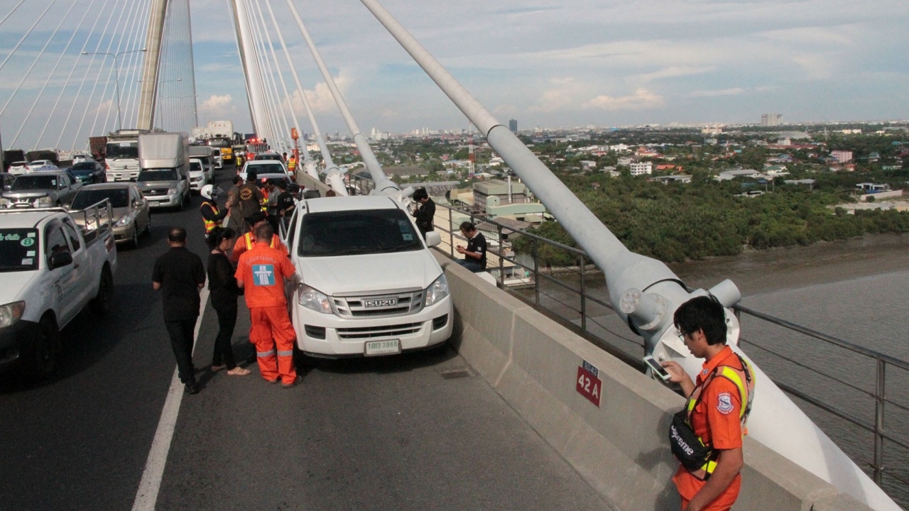 สมุทรปราการ หนุ่มพนักงานขับรถบริการ เก็บตัวอย่างปูนซีเมนต์ส่งไปตรวจสอบ คาดเครียดปัญหาส่วนตัว ดิ่งสะพานกาญจนาภิเษก จมหายในเจ้าพระยา ตร.เร่งสอบหาสาเหตุคิดสั้น
