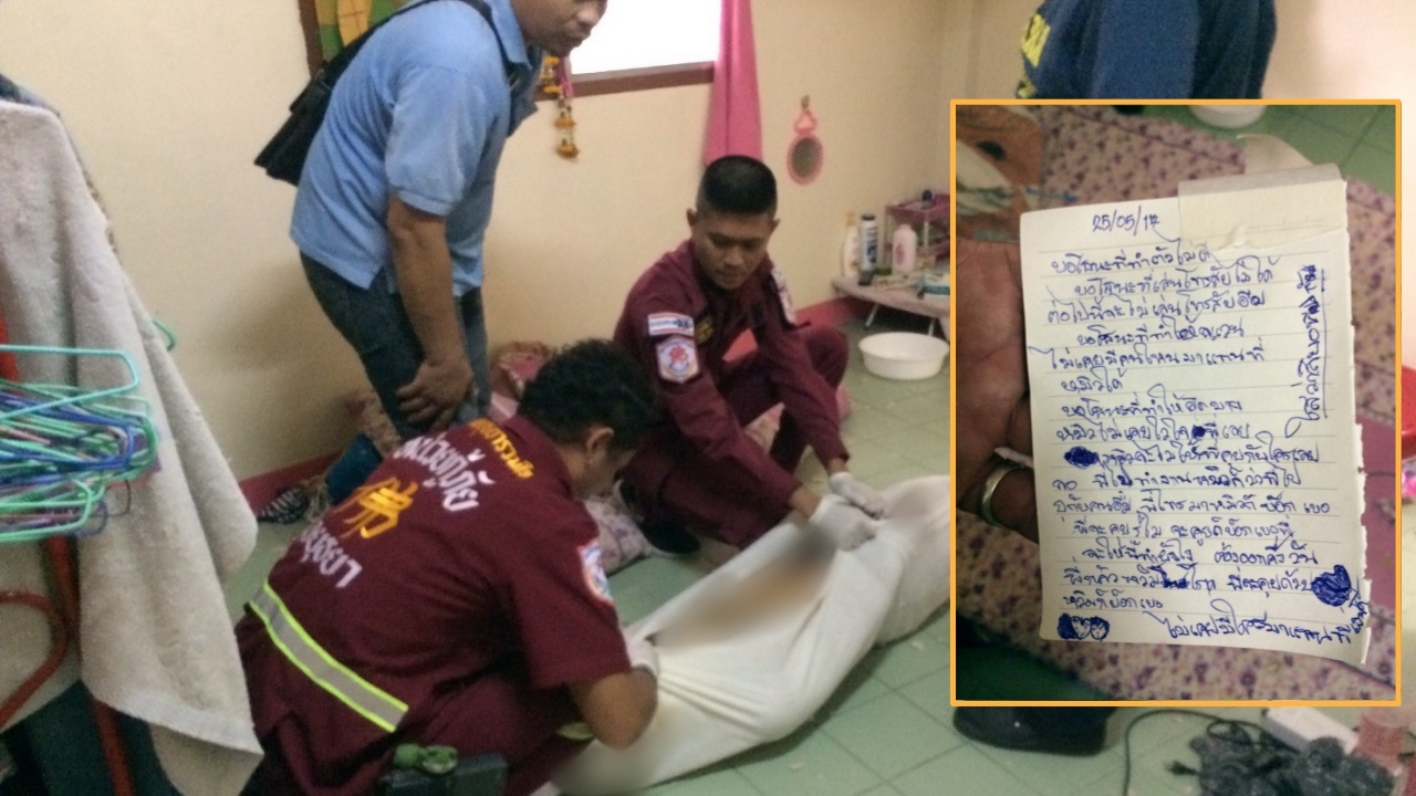 ตรวจสอบภายในห้องข้าวของอยู่ปกติไม่มีร่องรอยการต่อสู้และการรื้อค้น พบกระดาษเขียนข้อความติดไว้ข้างฝาจำนวน 1 แผ่น และที่พื้น 1 แผ่น รวม 2 แผ่น โดยแผ่นข้างฝามีใจความ “ขอโทษนะที่ทำตัวไม่ดี ขอโทษนะที่เล่นโทรศัพท์ไม่ได้ ต่อไปนี้จะไม่เล่นโทรศัพท์อีก ขอโทษนะที่ทำให้ระแวง ไม่เคยมีคนไหนมาแทนที่หมิวได้ ขอโทษนะที่ทำให้คิดมาก หมิวไม่เคยไว้ใจพี่เลย หมิวจะไม่ให้พี่คบกับใครเลยหรือ พี่ไปทำงานหมิวก็บ่น พี่ไปคุยกับคนอื่น พี่โทรหาหมิวก็บล็อกเบอร์ พี่จะคุยรู้ไหมจะให้พี่ทำอย่างไร ต้องออกครึ่งวันพี่กลัวหมิวโกหก พี่จะคุยด้วยหมิวก็บล็อกเบอร์ ไม่เคยมีใครมาแทนที่หมิวได้ ไสว่าสิบ่ถิ่มกัน” แผ่นที่ 2 มีใจความว่า “อ้ายขอโทษเด้อ ขอให้มันจบในคืนนี้ละ อ้ายบ่มีหยังให้ มีแค่เงินแค่นี้ละ ลาก่อนขอโทษ”